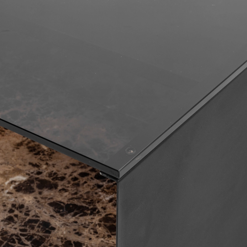 verre fumé, marbre emperador, acier finition époxy noir