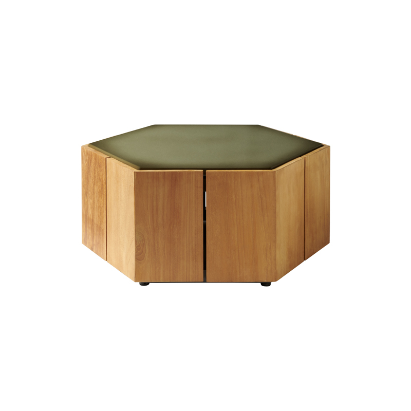 Nature is an inexhaustible source of inspiration. Marc Merckx's Hexagon tables, published by Tribu are proof of this. The designer was inspired by the Giant's Causeway, a gigantic geological formation in Northern Ireland. The teak structure of the table reproduces the geometry of hexagonal basalt columns. Hexagon incorporates a delicate, masterful balance in its proportions, as in the perfect symmetry of the honeycomb, its designer's second source of inspiration. The top of the Hexagon coffee table is made from enamelled lava stone, whose natural imperfections are highlighted by the crackled effect. The enamel coating makes the natural stone resistant to water, heat, frost, UV rays and stains. Hexagon pleases alone or accompanied, in "training".