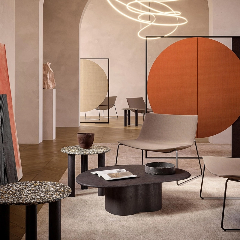 Edited by Arper, Ghia stands out for its soft, sculptural shapes and tactile materials inspired by nature. This collection of coffee tables brings a sense of harmony and calm to any space, thanks to a balance of organic geometric shapes.  Thanks to its expressiveness and the many versions available, the Ghia Arper coffee table collection adapts naturally to any type of environment, from reception areas to residential spaces, from lounge areas to living rooms. Two types of base, available in 3 different heights, support round or organic tops of various sizes, available in MDF, wood and Venetian terrazzo. Ghia allows you to create highly personal compositions by combining different models and mixing colours and finishes. The Ghia Arper collection is FSC-certified.