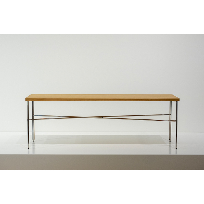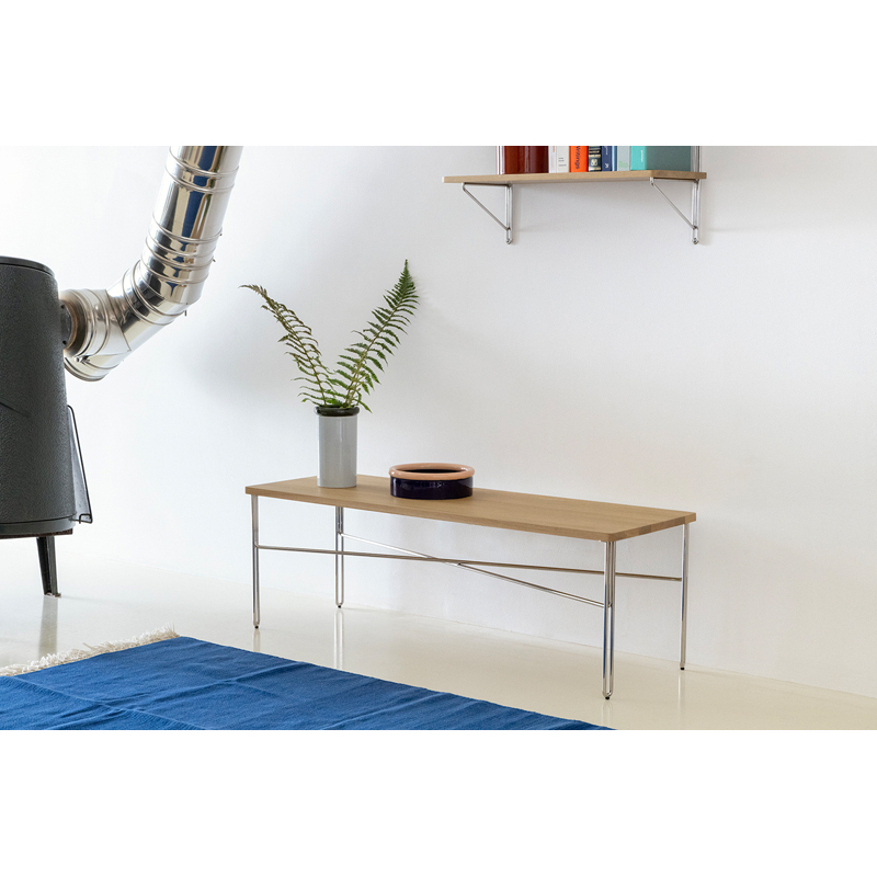 With Inline, Julien Renault has created a collection of simple, elegant pieces of furniture, distinguished by their structures made of parallel lines of stainless steel. These creations are based on the drawings of designer Julien Renault, where simple straight lines with tight radii come together to create elegant, solid structures. The legs of the Inline coffee table are made from polished stainless steel, while the top is made from solid oak. Edited by Nine, theInline coffee table is available in three formats. The collection also includes two wall shelves and a floor shelf.