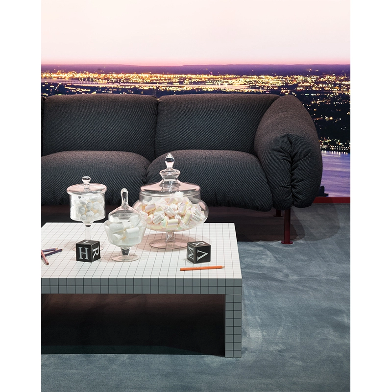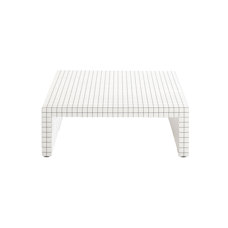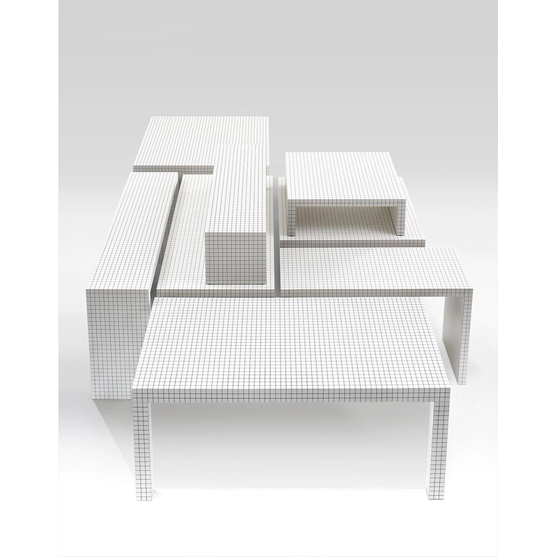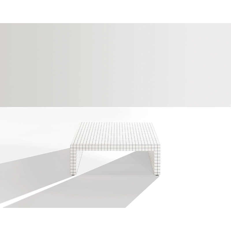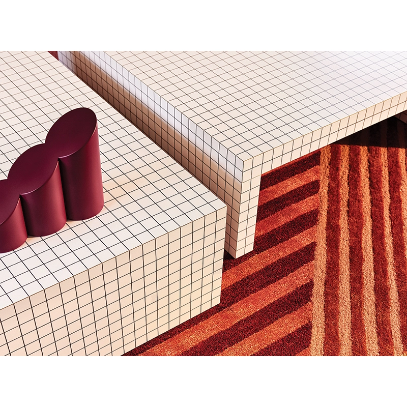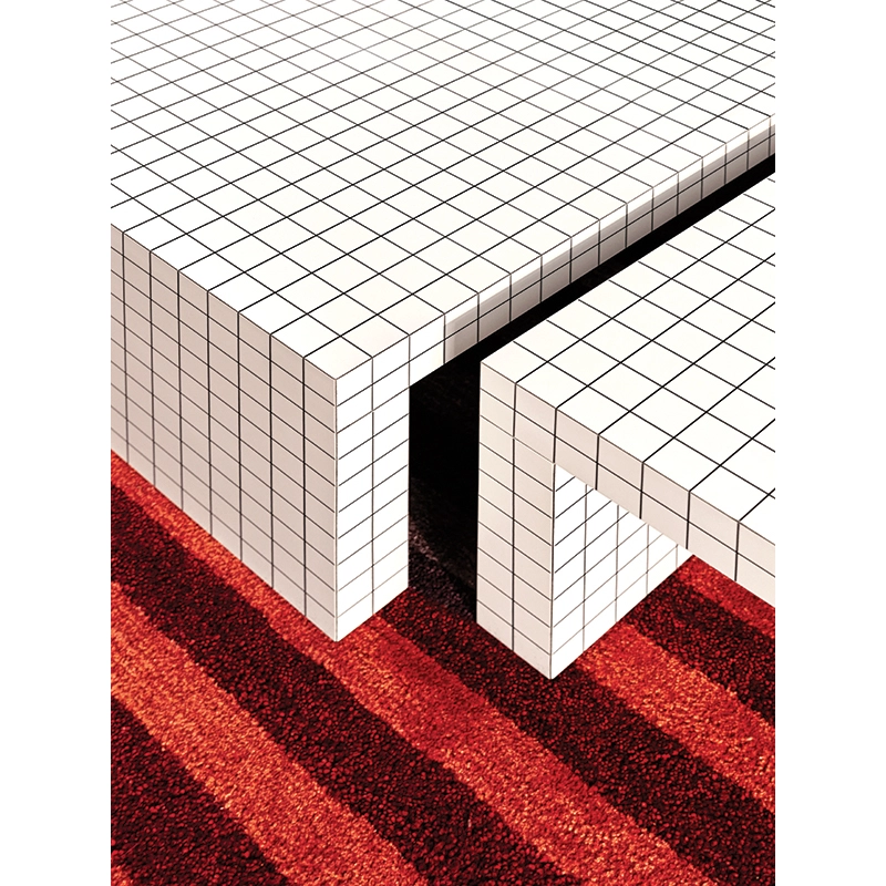 The products in the Quaderna collection are the result of a highly industrialised process and at the same time great craftsmanship. The tile laminate has been specially created based on Superstudio's design and features a 3 cm grid, produced using digital printing. This laminate is then applied by hand, requiring great precision and several hours of work for each piece. The convergence of the lines in the pattern creates a homogeneous surface, giving the furniture a strong personality.