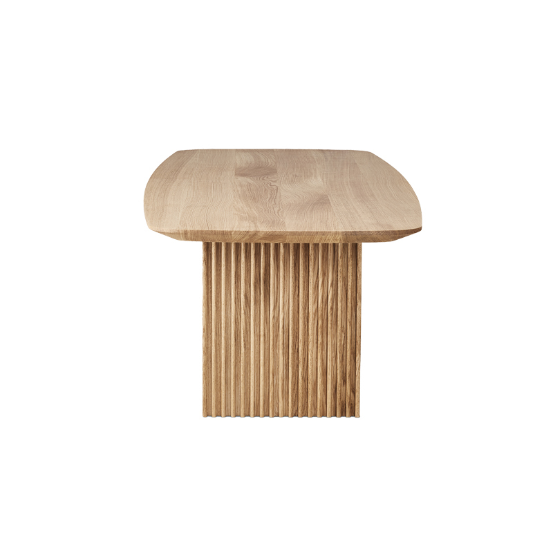The top and legs of Ten are solid wood, but it manages to give a feeling of lightness, underlined by the refined craft details such as the beautiful vertical grooves on the legs and the distinctive tabletop with its organic shapes. The slightly curved shape of the tabletop has no straight lines and, in combination with the sloping edge of the table, it appears that the top is constantly moving, giving the Ten table a unique expression.