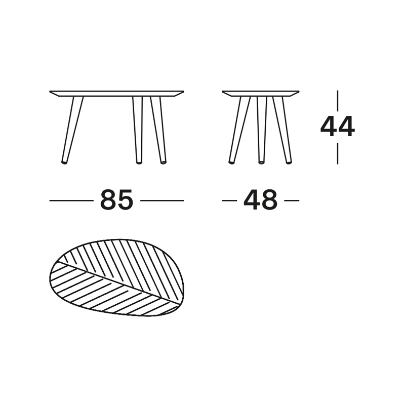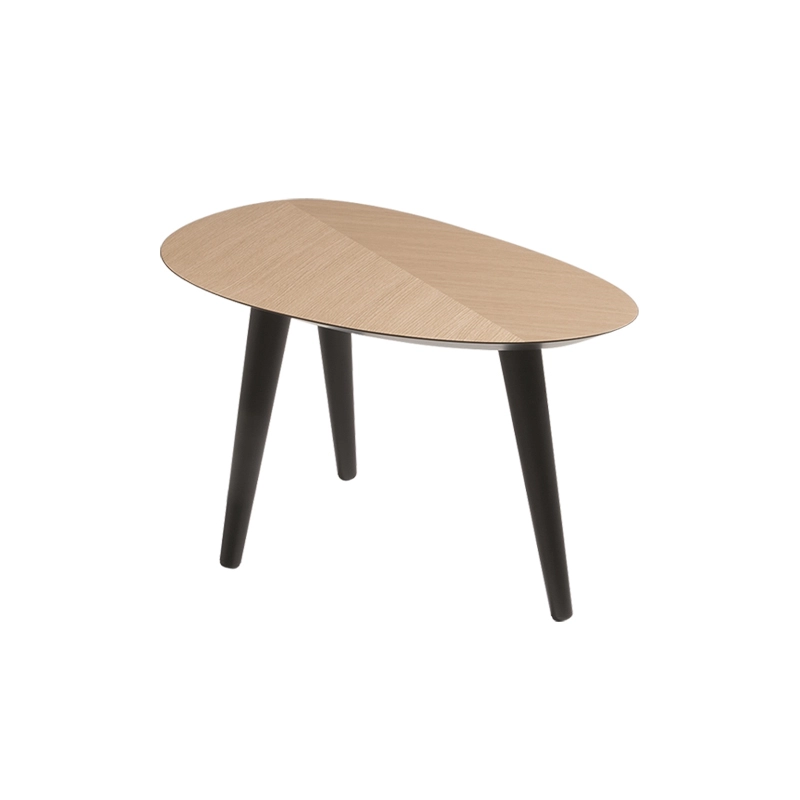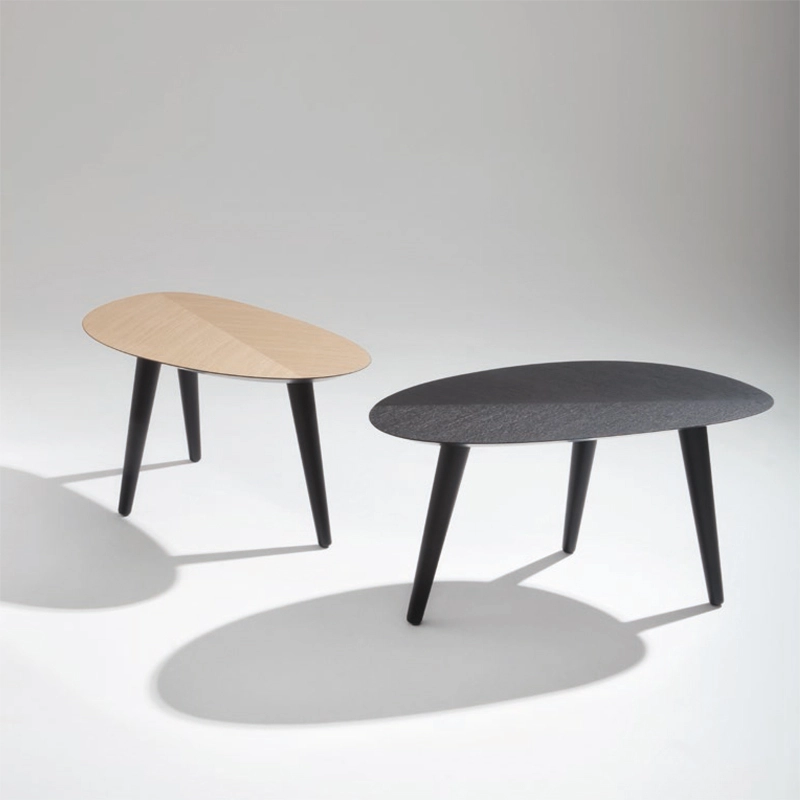 Following on from the Tweed dining tables, Garcia Cumini and Zanotta are offering Tweed mini, a coffee table available in three sizes. The small Tweed Mini tables can be used on their own or as compositions of several models, playing with the different overlapping heights for an ensemble full of character. The tray of Tweed Mini stands out for its organic shape and impressive surface, requiring extremely precise work, which gives it an unusual perception, changing depending on the point of view. Thin sheets of solid oak or Canaletto walnut wood are carefully placed side by side until the natural lines of the wood create a graphic sign in continuity with the diagonal line that separates the two parts of the table top, almost as if it were forming the veins of a leaf. Depending on, the model, each Tweed Mini table is mounted on three or four matt black tubular steel legs, guaranteeing perfect stability.