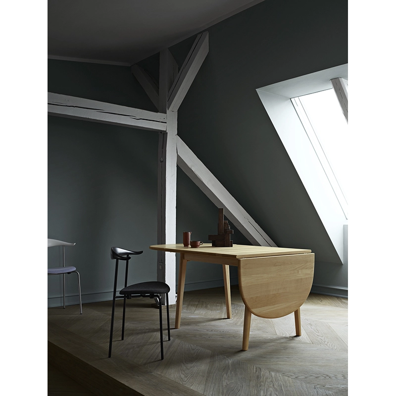 The dining table CH002, edited by Carl Hansen, highlights Hans J. Wegner's exceptional attention to detail and functionality. The CH002 table is ideal for small spaces but also for more spacious environments, thanks to its sleek, intelligent design. The table has folding extensions at both ends that can be easily lifted out to accommodate extra guests. The solid beech or oak design blends elegantly with all Wegner dining chairs, taking on a different, individual expression depending on the chair, the type of wood and the finish chosen. The table is also available in a similar larger edition under model number CH006.