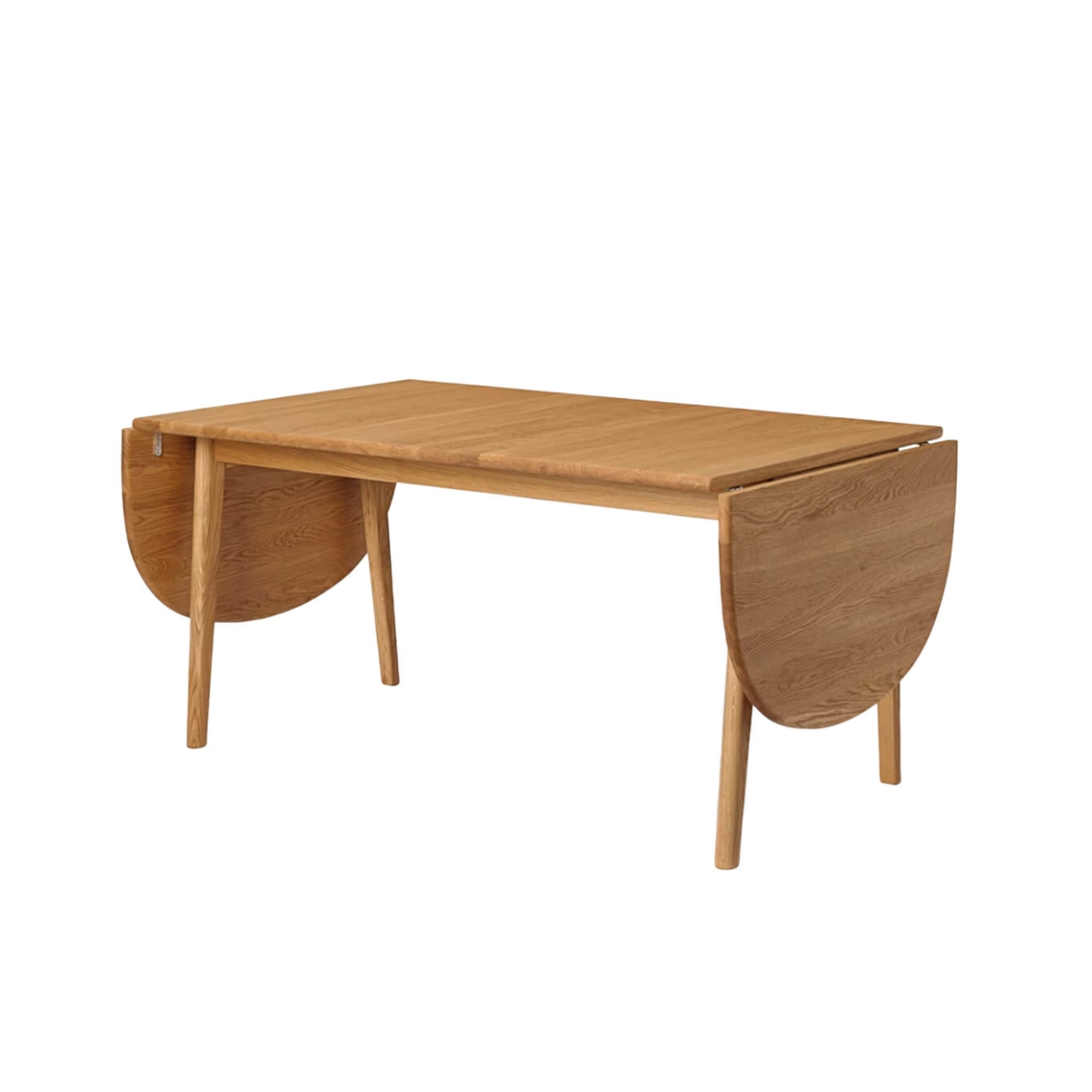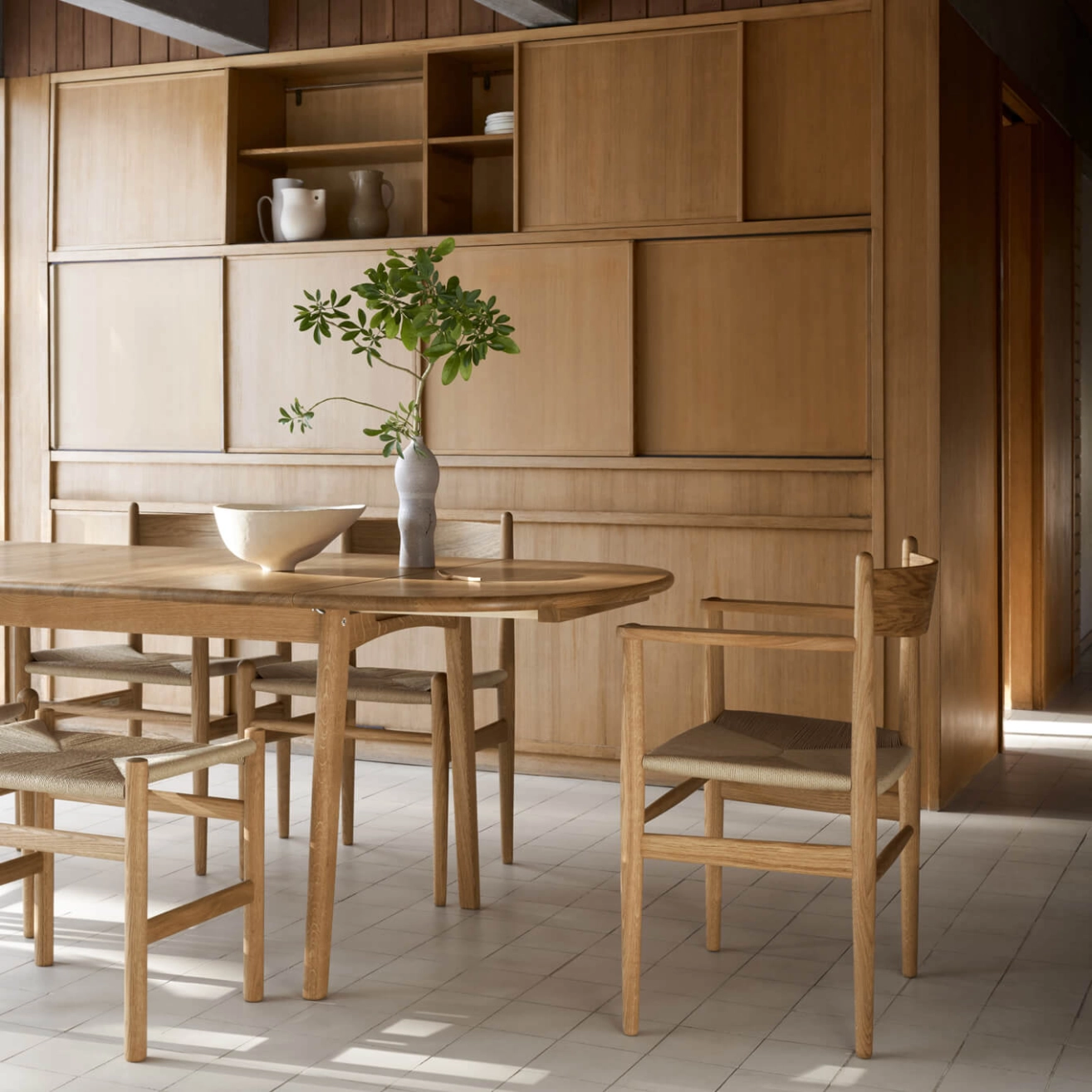 The Ch006 dining table, edited Carl Hansen, highlights Hans J. Wegner's exceptional attention to detail and functionality. The table CH006 is ideal for small spaces but also for more spacious environments, thanks to its sleek, intelligent design. The table has folding extensions at both ends that can be easily lifted out to accommodate extra guests. The solid beech or oak design blends elegantly with all Wegner dining chairs, taking on a different, individual expression depending on the chair, the type of wood and the finish chosen. The table is also available in a similar smaller edition under model number CH002.