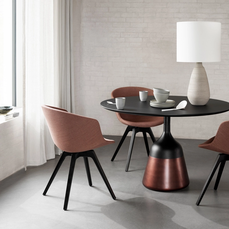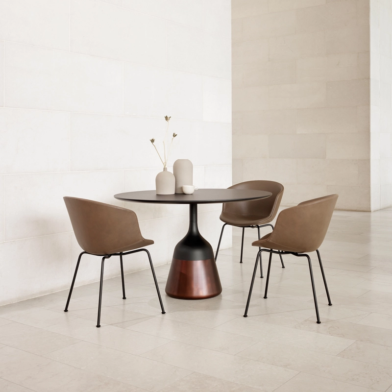 Created by 365 North for Wendelbo, the Coin dining table effortlessly fuses conical and circular components to create a piece that is both minimalist and organic. This user-friendly round table has a tapered cast aluminium central leg for perfect stability. With its elegant finishes and soft silhouette, the Coin dining table goes well with many styles of chairs.