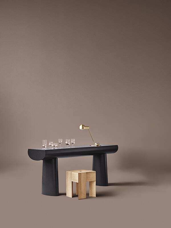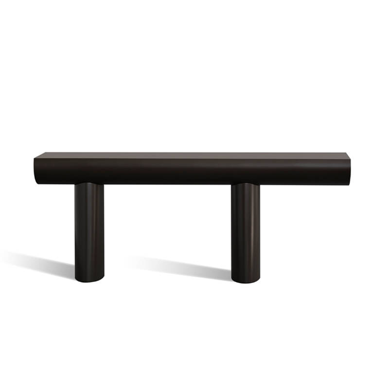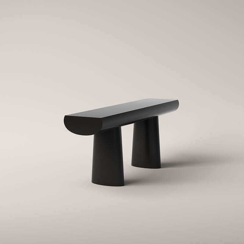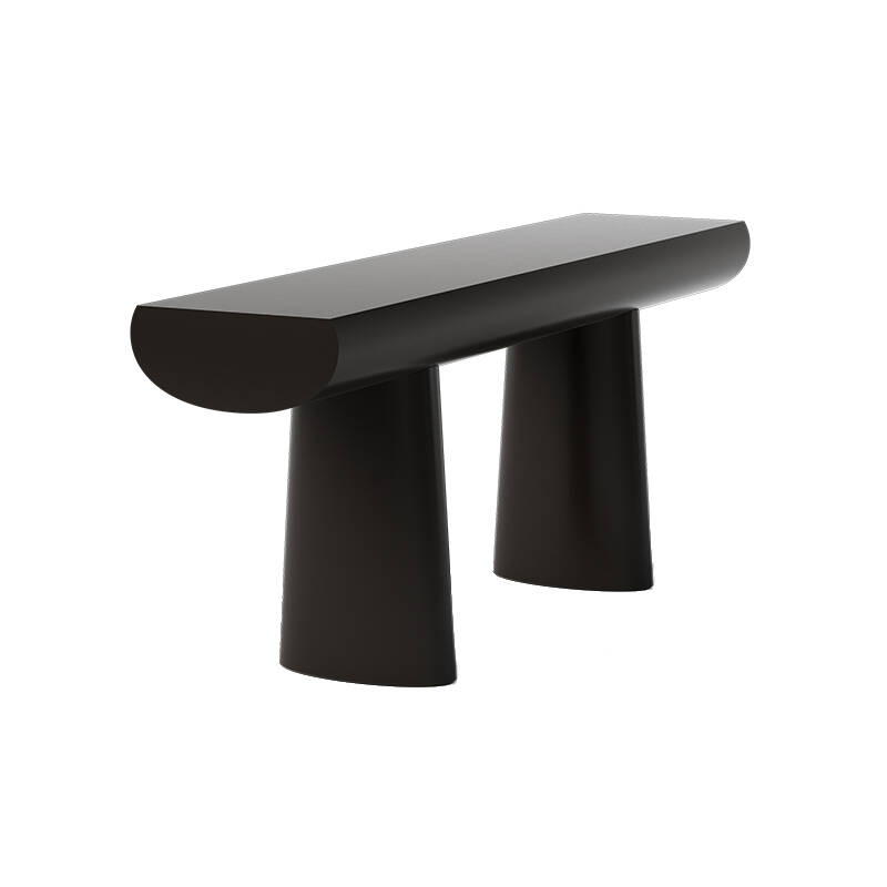 With its seductive, soothing silhouette, Aldo Bakker's Console table floats exquisitely between sculpture and furniture. It depicts the simplest concept of a table: two columns and a surface. The feet are an extension of the line created by the tray. The top and base of the legs are the same width, making them equally important to the design. The distance between the legs is not fixed, but can be altered to suit your preferences, adding to the sculptural quality of this Karakter piece.