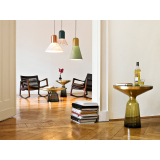 Sebastian Herkner's collection Bell Table overturns the usual use of materials by combining glass, a light and fragile material used for the base, and a top made of metal, which seems to float above it. The stained-glass base is traditionally blown into a wooden mould. With its sculptural presence, Bell Side Table contrasts with the brass frame while forming a harmonious unit reminiscent of the curves of a bell. Thanks to its reflective surfaces and contrasting materials, the Bell Side Table adds a refined, delicate touch to the living room. It celebrates the beauty, colours and shapes of the materials, combined with the qualities of meticulous craftsmanship. The Bell Coffee coffee table and Bell Side side table are unique and fragile pieces, each made entirely by hand and edited by Classicon.