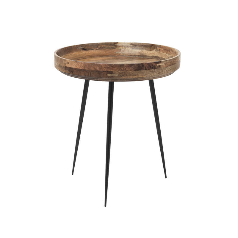 Published by Mater, the Bowl collection of pedestal tables and coffee tables reconciles Indian craftsmanship with the simplicity of Scandinavian design. The tray is made from mango wood from sustainable sources. It showcases the skills of Kharadi, an Indian community of woodturners, and supports their local crafts. The table Bowl can be used on its own or as a composition of several sizes. The finish used on the top is a lead-free, water-based lacquer. The legs are made of milled steel rods and can be detached for easy working and transport.