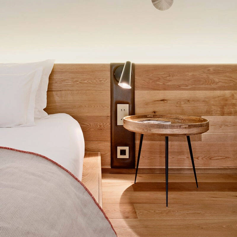 Published by Mater, the Bowl collection of pedestal tables and coffee tables reconciles Indian craftsmanship with the simplicity of Scandinavian design. The tray is made from mango wood from sustainable sources. It showcases the skills of Kharadi, an Indian community of woodturners, and supports their local crafts. The table Bowl can be used on its own or as a composition of several sizes. The finish used on the top is a lead-free, water-based lacquer. The legs are made of milled steel rods and can be detached for easy working and transport.