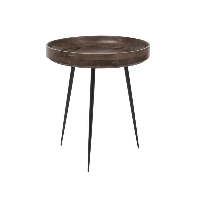Published by Mater, the Bowl collection of pedestal tables and coffee tables reconciles Indian craftsmanship with the simplicity of Scandinavian design. The tray is made from mango wood from sustainable sources. It showcases the skills of Kharadi, an Indian community of woodturners, and supports their local crafts. The table Bowl can be used on its own or as a composition of several sizes. The finish used on the top is a lead-free, water-based lacquer. The legs are made of milled steel rods and can be detached for easy working and transport.