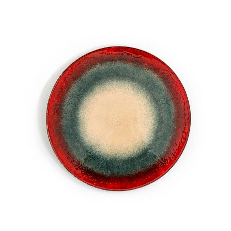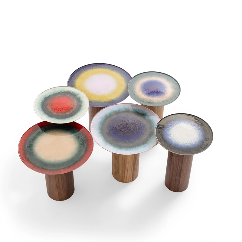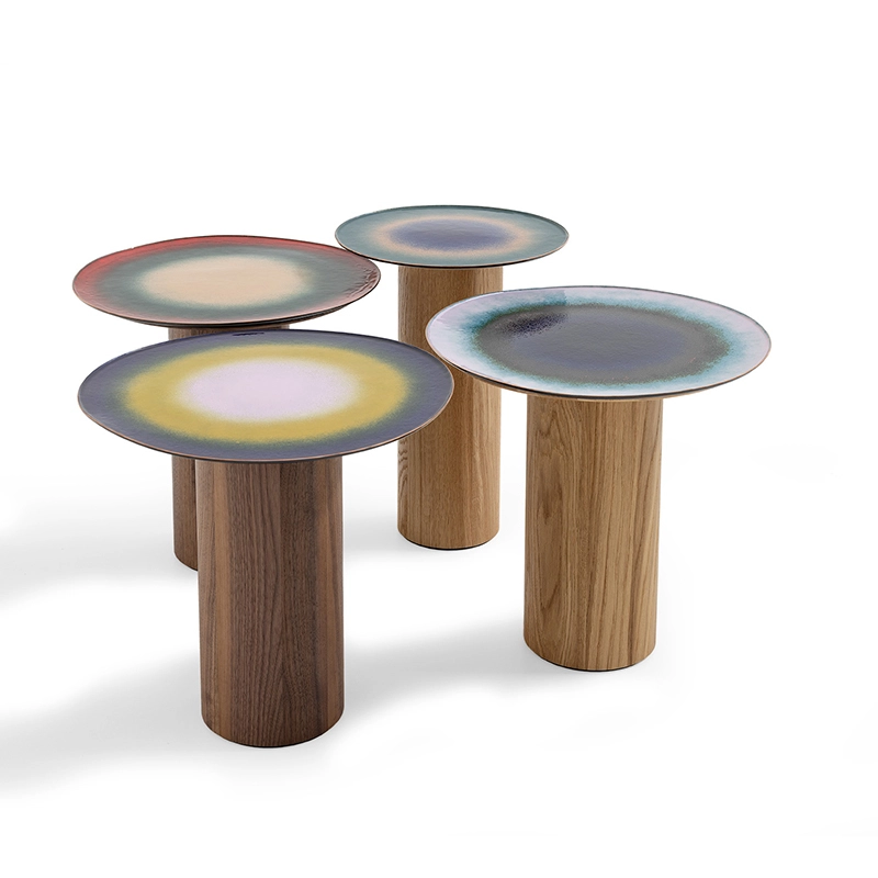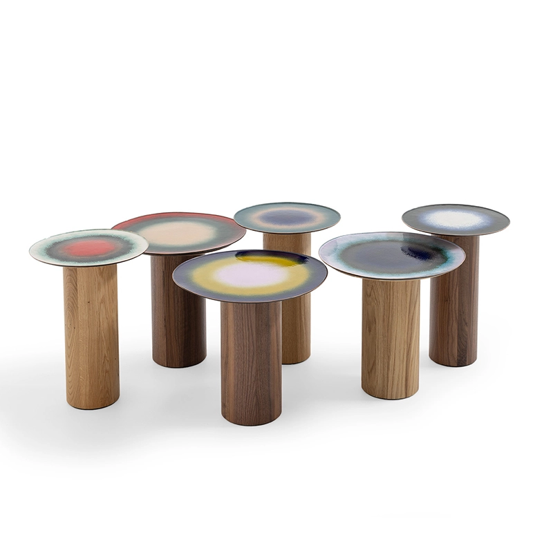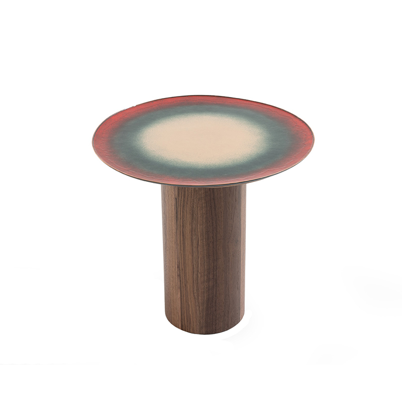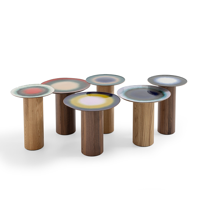 Mangiafuoco is a series of small, unique tables designed by design duo Zanellato/Bortotto for Moroso. On this small round table, the large enamelled surface is criss-crossed by a variety of unpredictable shades resulting from the combination and overlapping of the glass powders and strict adherence to the necessary firing time. The wooden base adds a warm touch and blends in perfectly with the colours of the tray. The process used to create the Mangiafuoco tables gives each piece a unique character, a particularly seductive imperfection.