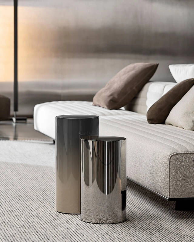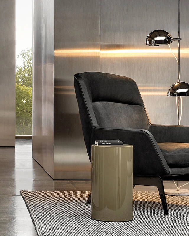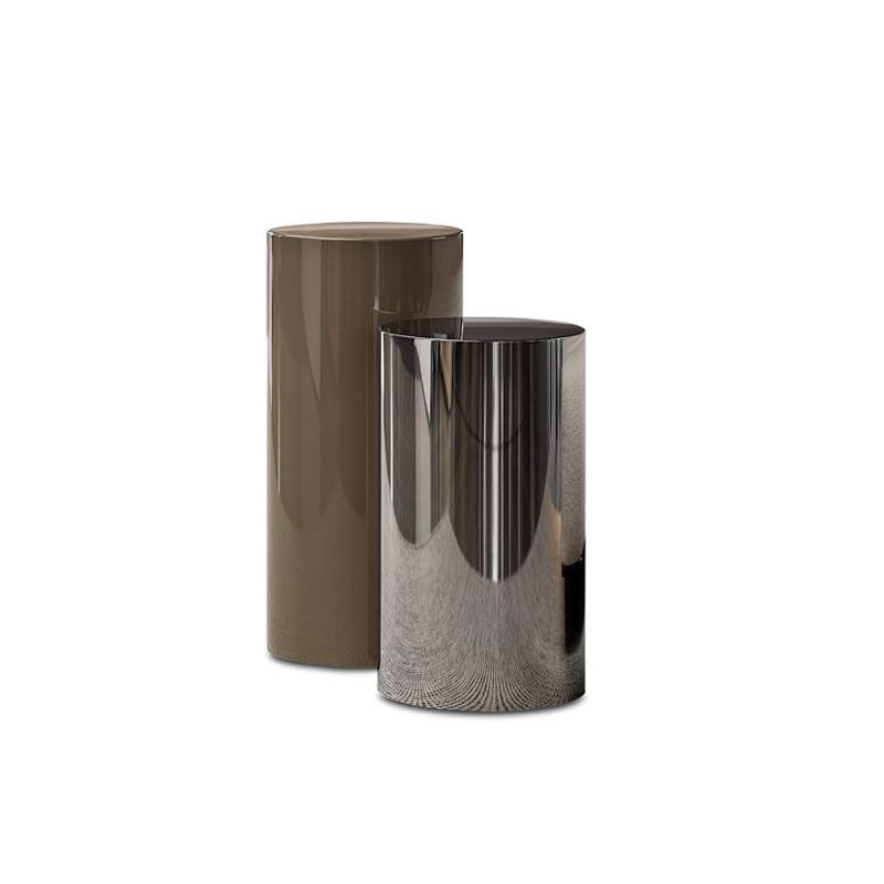 Designed as a purely geometric solid, Rodolfo Dordoni's Pilotis lights up with metallic gleams and is transformed into an art object in living rooms as well as in the various rooms of your home. Its name refers to one of the distinctive architectural features of Rationalism: the stilts on which the buildings of the period rise slightly. The Pilotis side table comes in two heights of the same diameter and in a rich range of finishes: mirror-effect stainless steel or metal painted with gloss paint in Army Green, Navy Blue, Mocha or Cappuccino. In the highest version, in high-gloss painted metal, the surface can be embellished with shades of Army Green/Cappuccino, Granite/Cappuccino, Mocha/Ice and Navy Blue/Ice.