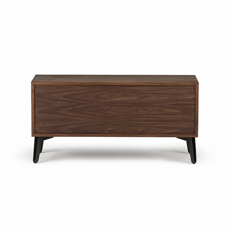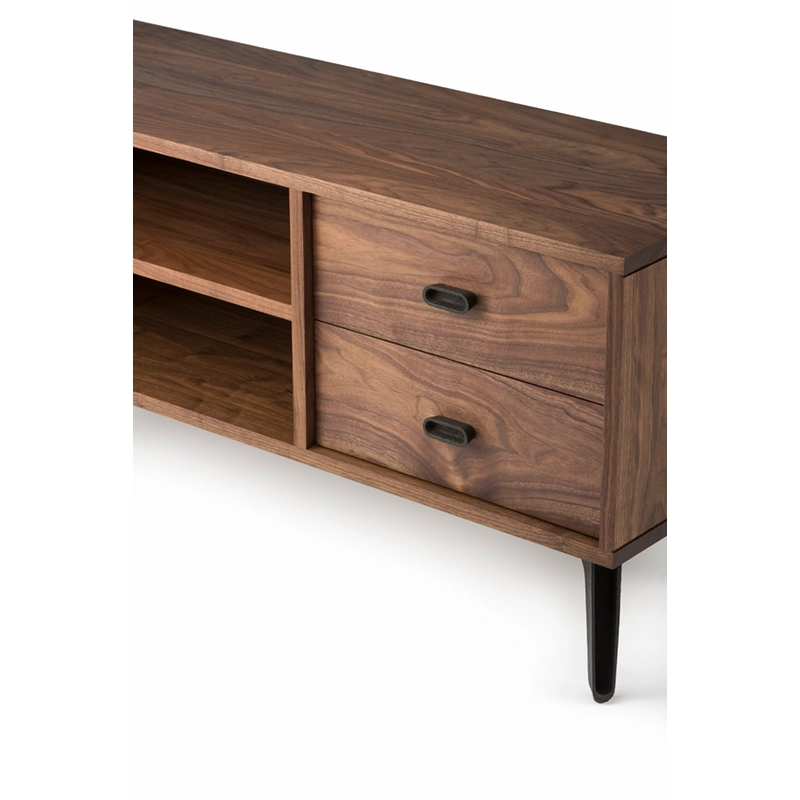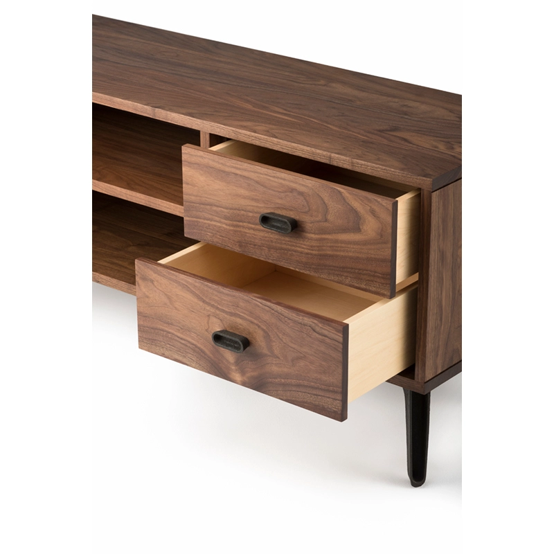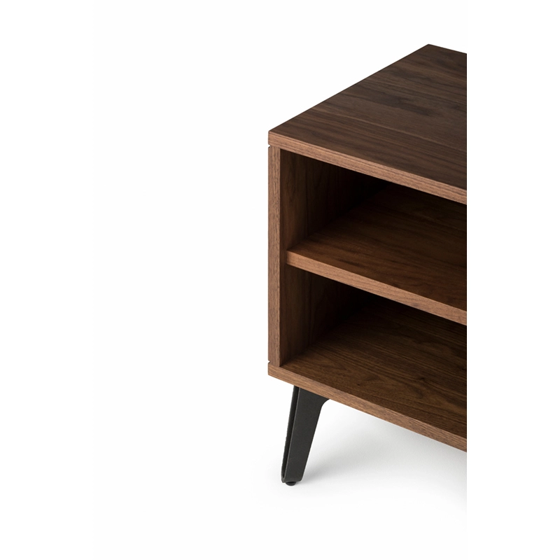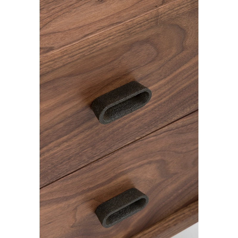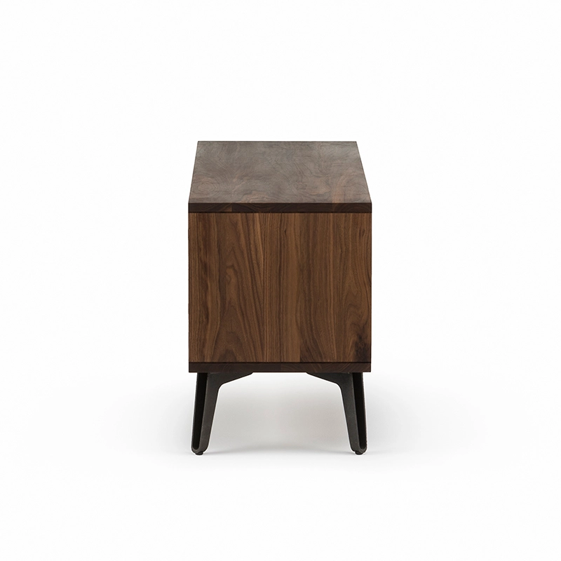 The McQueen bedside cabinet offers ample storage space in classic shapes with a beautiful contrast of materials. The solid wood body is punctuated by cast-iron handles and drawer legs. Each drawer front is made from a single plank of wood, carefully chosen for its beauty and proportions and how well the unique colour and grain match the other drawer fronts. The drawers are detailed with dovetail joinery and a smooth closing mechanism. The McQueen bedside cabinet, made up of shelves and two drawers, is available in left or right-hand versions to allow the drawers to be closest to either side of the bed. The unit includes wire management.
