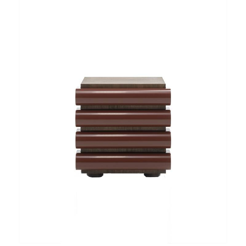 The structure of Storet is made of stained walnut wood, and each of its drawers is dressed in a delicate lacquered coloured finish, which gives the piece of furniture its dynamism.