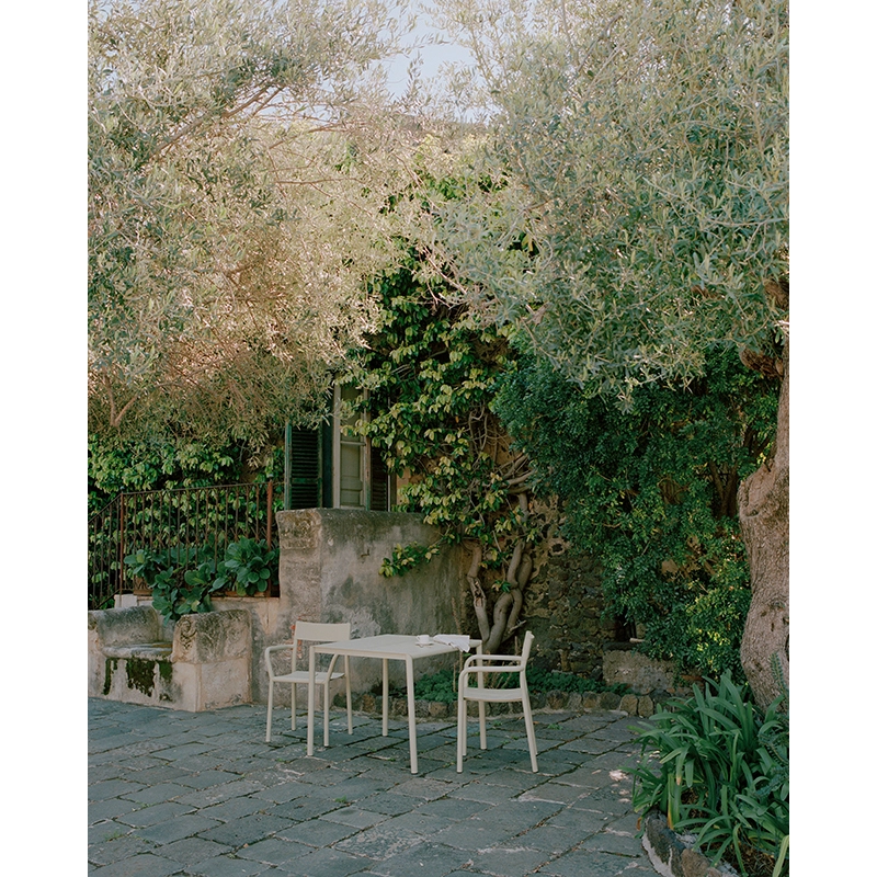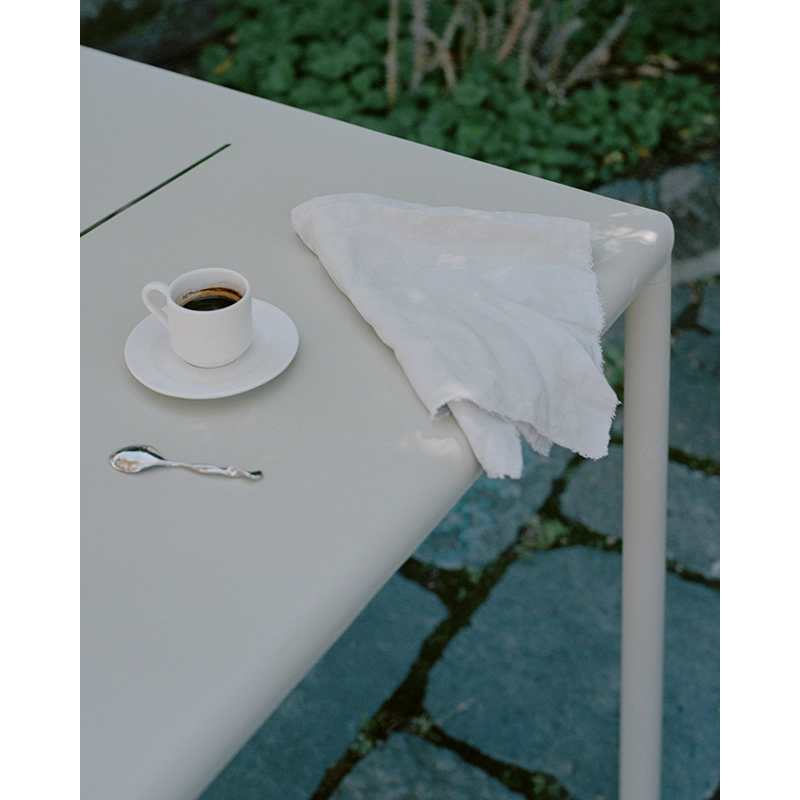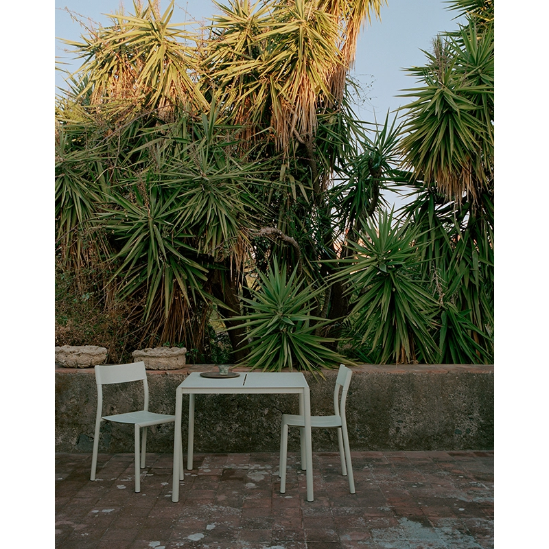 New Works has created the May collection, featuring seating and tables designed specifically for outdoor spaces. Made from powder-coated steel, the table May 85x85 is resistant to all weather conditions. The design of the May series is distinguished by its elegant simplicity and precise detailing, marrying a delicate, powder-coated surface with a robust steel frame. The table May 85x85 has a surface with a slot in the middle to facilitate water drainage, a feature also present on the seats in the series. This clever design creates a repetition of lines that brings lightness and coherence to all the outdoor furniture. This table represents the perfect marriage between elegance and functionality, offering outdoor spaces such as gardens, patios, terraces and balconies durable and aesthetically pleasing furniture. The May 85x85 table from New Works thus embodies the ideal compromise between contemporary style and practicality, adding a touch of elegance to any outdoor environment.