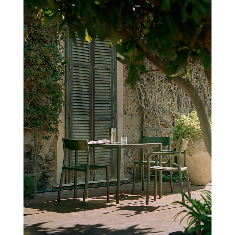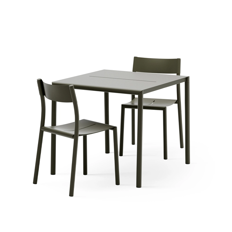 New Works has created the May collection, featuring seating and tables designed specifically for outdoor spaces. Made from powder-coated steel, the table May 85x85 is resistant to all weather conditions. The design of the May series is distinguished by its elegant simplicity and precise detailing, marrying a delicate, powder-coated surface with a robust steel frame. The table May 85x85 has a surface with a slot in the middle to facilitate water drainage, a feature also present on the seats in the series. This clever design creates a repetition of lines that brings lightness and coherence to all the outdoor furniture. This table represents the perfect marriage between elegance and functionality, offering outdoor spaces such as gardens, patios, terraces and balconies durable and aesthetically pleasing furniture. The May 85x85 table from New Works thus embodies the ideal compromise between contemporary style and practicality, adding a touch of elegance to any outdoor environment.