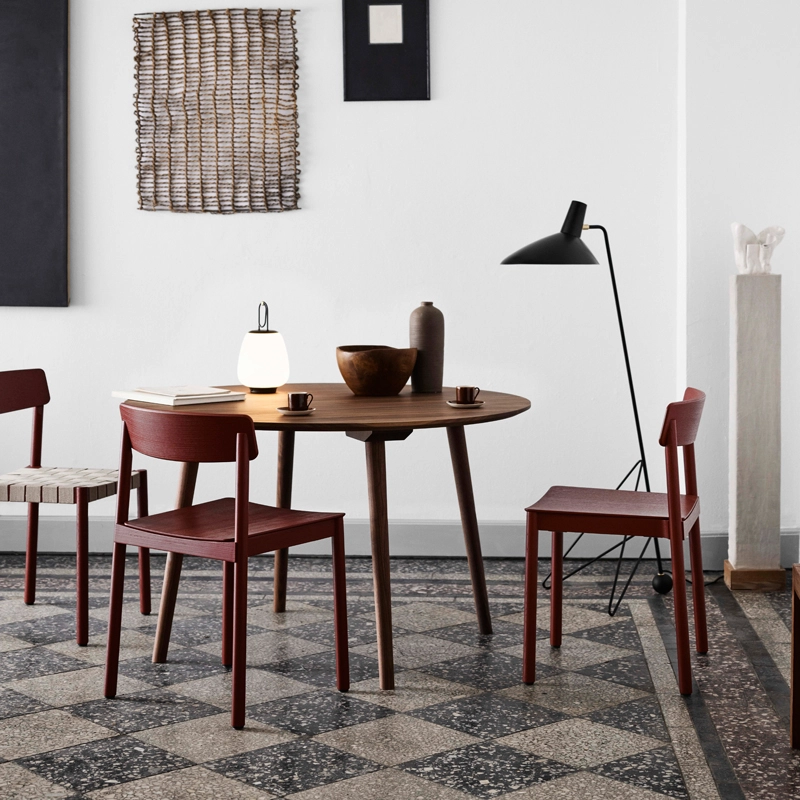Edited by And Tradition, the In Between table was designed to accompany the chair of the same name. Designed by Sami Kallio, this dining table reinterprets certain aspects of the chair in terms of its form and the techniques employed. The solid oak used is a hardy and reliable wood in the Scandinavian tradition. Like the chair, the In Between table is a showcase for the designer's expertise and hand-crafted woodwork. Producing the chair requires modern industrial processes and manual interventions, creating a harmony between innovation and tradition. Thanks to its round shape and two available diameters, in Between by And Tradition blends easily into interiors and brings a dynamic touch to the room it's in.