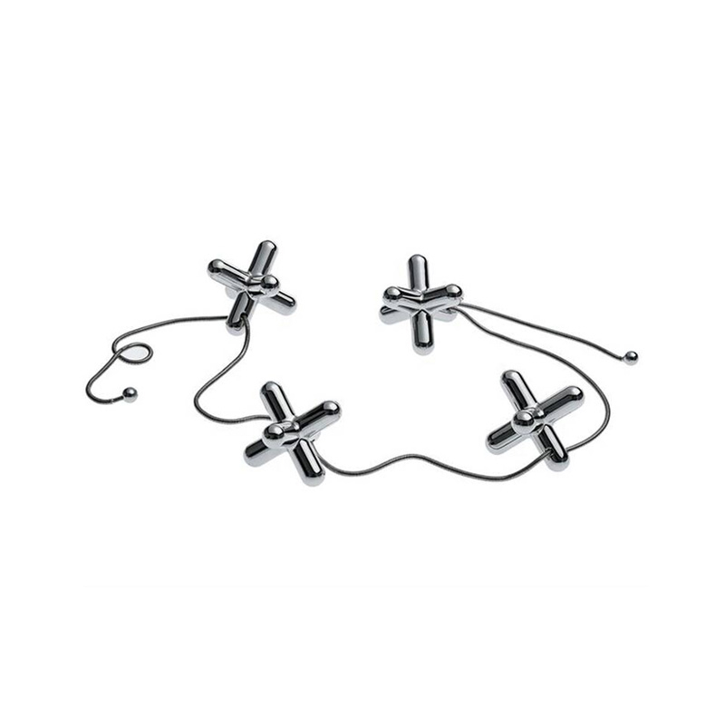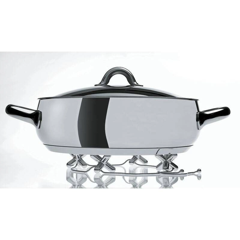 Tripod is a trivet with moving parts in chrome-plated zamac. Created by young designer Gabriele Chiave for Italian publisher Alessi in 2007, Tripod looks like a piece of jewellery, designed to be hung from a kitchen hook and tossed like dice on the table to place pots and hot dishes on. The elegant, playful approach of this trivet contrasts with its function as a modest object. Stable and suitable for all sizes of dish, Tripod is perfect for enhancing a dining table, and suspended, it decorates the kitchen with its unusual shape.