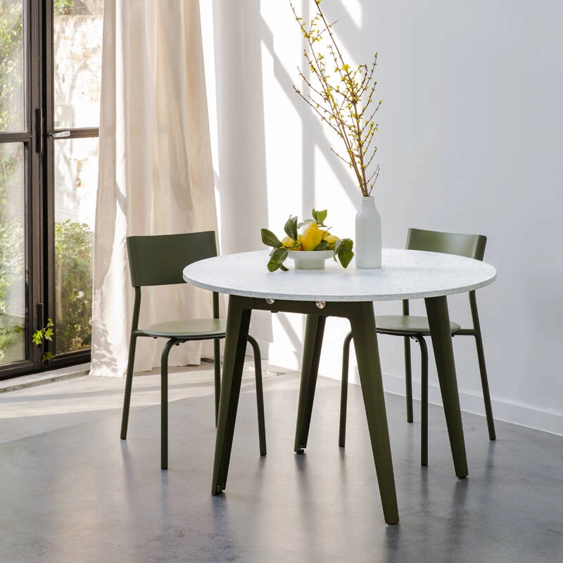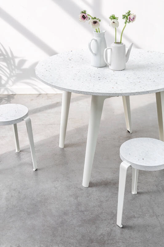 The NEW MODERN round dining table by TIPTOE is ideal for seating 4 to 6 people. It has a steel base and a recycled plastic top, made from the waste of hundreds of yoghurt pots. Created by TIPTOE, the New Modern collection is the result of a year's work and iterations to create a modular table system that is as functionally and industrially efficient as it is sustainable. Like every TIPTOE object, the NEW MODERN system has been designed with an eye to controlling our impact throughout the product lifecycle. Sleek, robust and modern, the New Modern table is equally at home in domestic and professional environments.