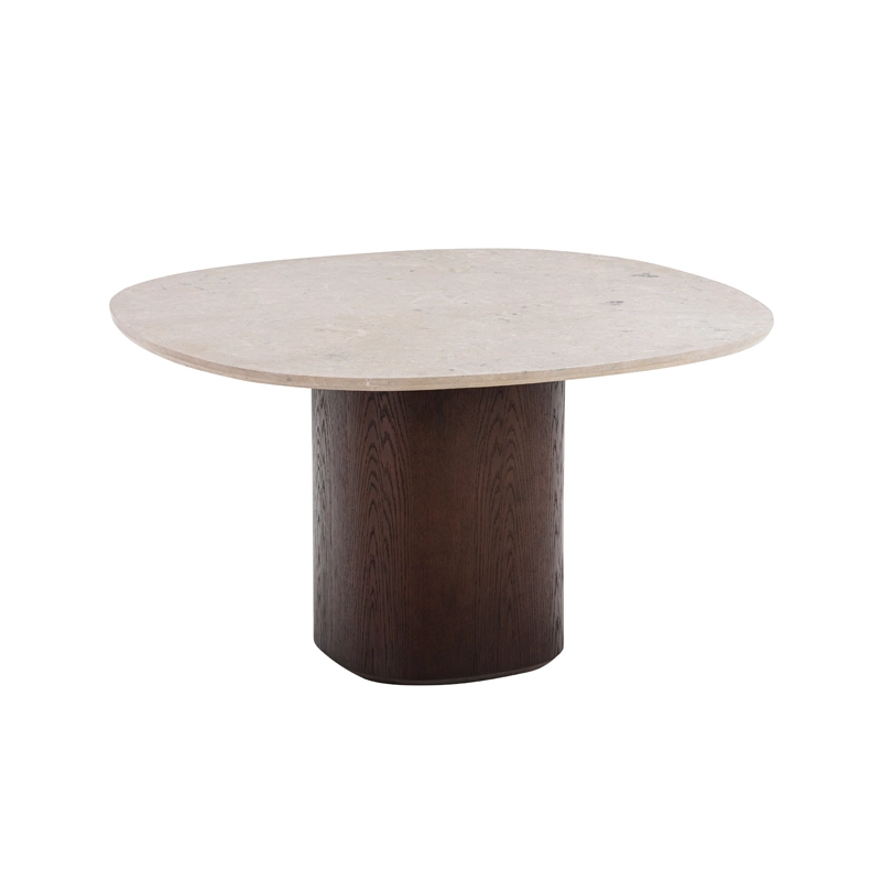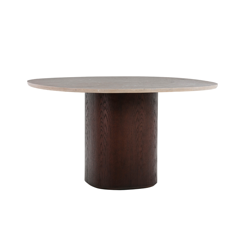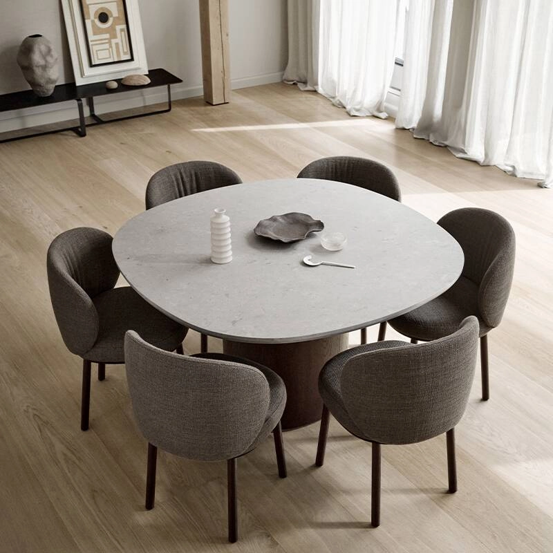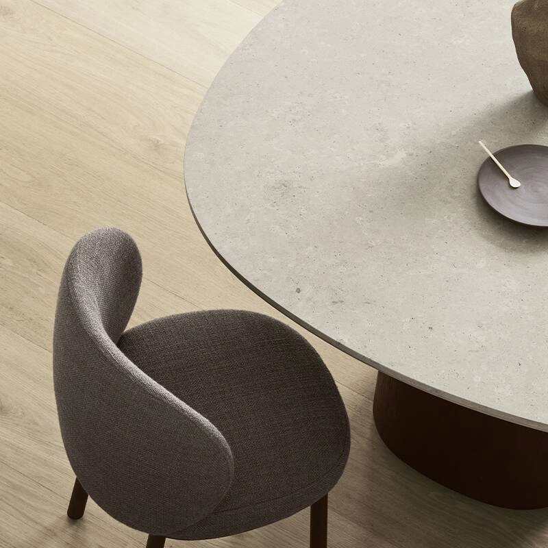The Ovata table imagined by Swedish Design studio Note for the Wendelbo brand is made with a magnificent moulded top in grey Jura limestone mounted on an oak veneer column leg. Almost monumental, the Ovata table effortlessly balances tactile surfaces, natural materials and a streamlined aesthetic. The top of the table Ovata is characterised by its distinctive rounded square shape exuding a very elegant natural look derived from matt polished Jura limestone with subtle fossil marks, reflecting the unique terroir of its origin. Seating up to 6, the Ovata Wendelbo dining table, is perfect with the chairs from the same collection.