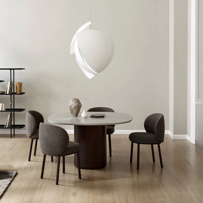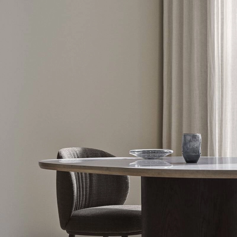 The Ovata table imagined by Swedish Design studio Note for the Wendelbo brand is made with a magnificent moulded top in grey Jura limestone mounted on an oak veneer column leg. Almost monumental, the Ovata table effortlessly balances tactile surfaces, natural materials and a streamlined aesthetic. The top of the table Ovata is characterised by its distinctive rounded square shape exuding a very elegant natural look derived from matt polished Jura limestone with subtle fossil marks, reflecting the unique terroir of its origin. Seating up to 6, the Ovata Wendelbo dining table, is perfect with the chairs from the same collection.