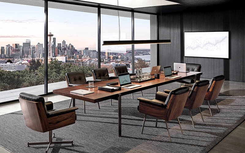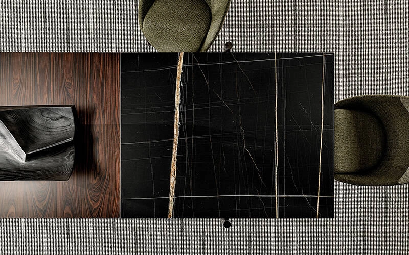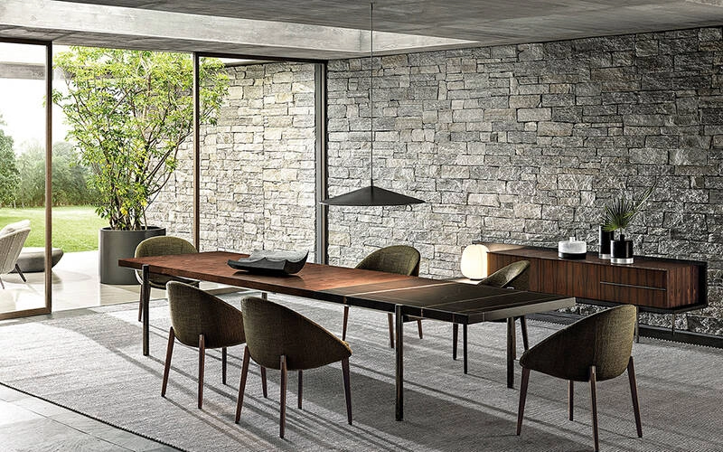 Distinguished by its rectangular shape, generous dimensions and essential lines, the Superquadra table by Minotti is supported by four polished Brandy aluminium legs. Protruding flush with the tabletop, its feet give it an ethereal appearance. Minotti has made the Superquadra table available in 4 sizes (from 250 cm to a length of 400 cm), in versions that highlight its aesthetic and material qualities: Dark Brown-stained Santos rosewood lacquered in matt polyester, flamed ash lacquered in open-pore Black and Dark Brown-stained Santos rosewood matched with matt polyester-lacquered Sahara Black marble. The Superquadra table by Minotti lends originality and personality to domestic and professional spaces with its lines.