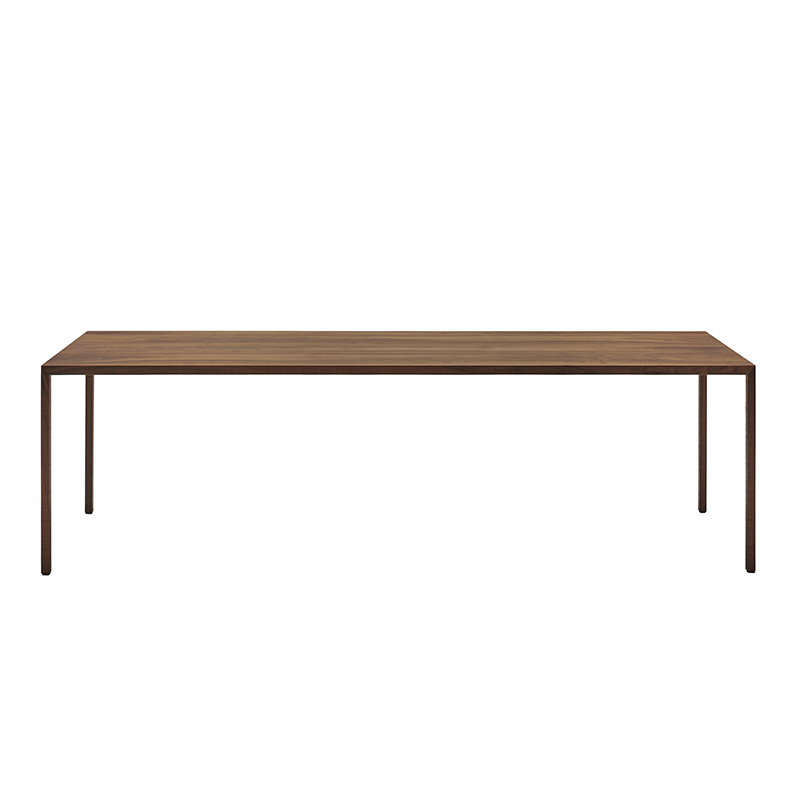 Known for its minimalist design and technical prowess, Tense is now available in a wooden version. Designed by Piergiorgio & Michele Cazzaniga, this single-material table impresses by its ability to hold itself in tension, allowing it to be made in exceptional dimensions. The extremely thin 35 mm top is a panel consisting of an internal aluminium profile frame filled with polystyrene and then covered with oak veneer. The steel legs, 35x35 mm section, are also coated with this veneer. The proportions of the table give a feeling of lightness and the finish adds a warm touch. MDF Italia has produced an elegant table with a sober and pure design to fit perfectly in your dining room or for professional use.
