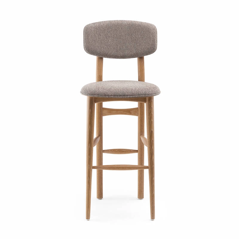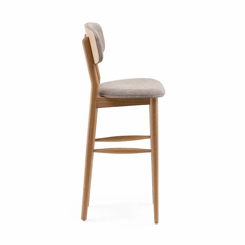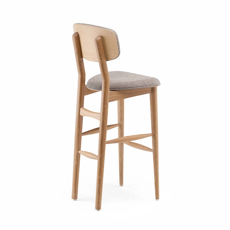 Butterfly by De La Espada is a comfortable, understated bar stool with a wooden back that recalls the wings of its namesake. With its refined upholstery on the seat and back and sturdy wooden frame, it is suitable for a variety of environments.