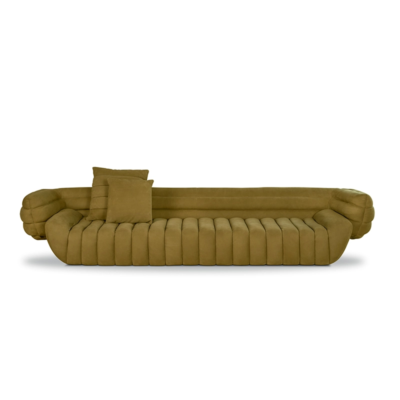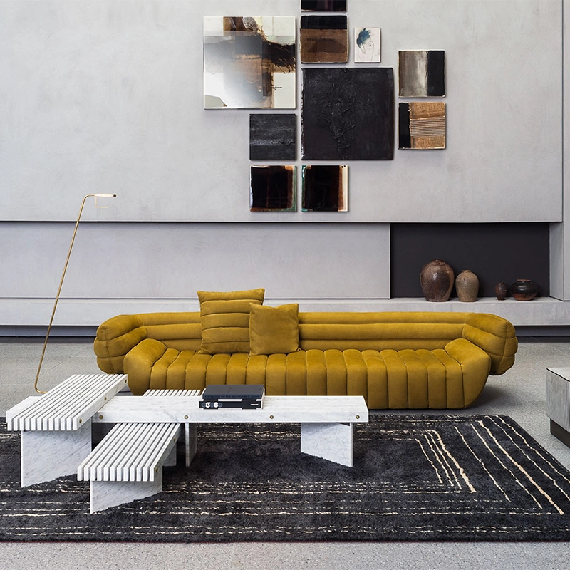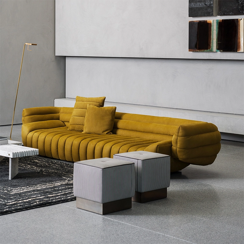 Tactile sofa is deconstructed and broken down into two elementary parts. The seat and back become independent elements and different padding highlights the distinction between the two elements. The two parts are only fixed to one another at essential points for stability so they appear to be hardly in contact with each other, making the sofa feel light and airy despite its generous size.