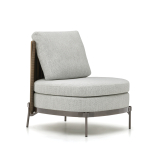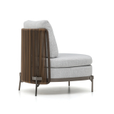 The line of Tape seats, designed by Nendo for Minotti, extends quite naturally to the outdoors without giving up the undeniable elegance of its forms and the essence of its project, duly revisited through certain variations for the outdoors. The seats become deeper, conducive to relaxation, while the metal structure, offered in an open-air finish, is covered with rattan-effect ropes. Tape's stitching detail — the ribbon that holds the foot in place — translates here into a light bronze metal plate. Published by Minotti, the Tape Cord Outdoor system includes numerous elements perfect for creating relaxing corners whether in gardens or on terraces: from the armchair to the sofa, via the chaise longue or even a particularly original open-back sofa, not forgetting the chair and small tables.