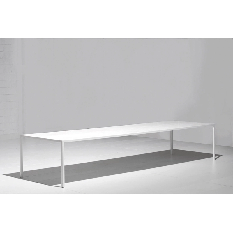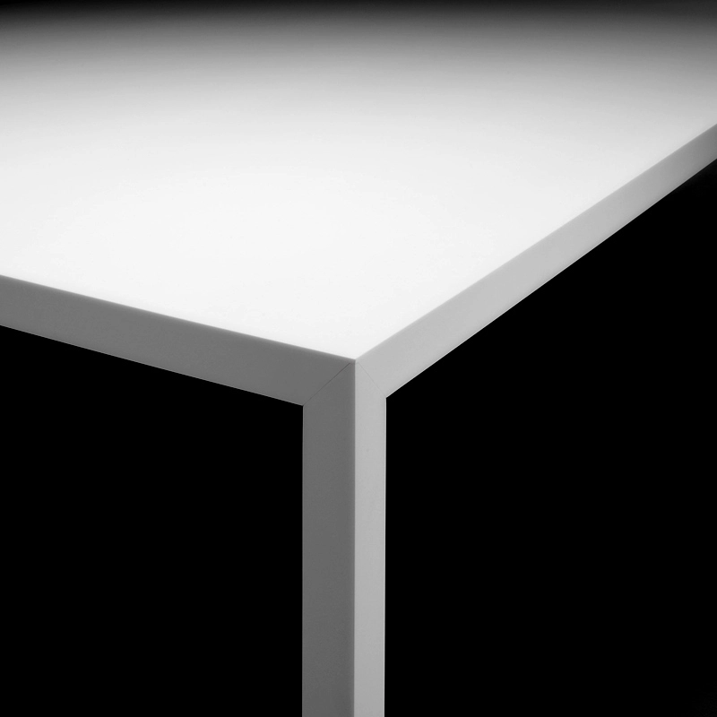 Tense, which means 'tension' in English. Different inner layers of the tabletop produce perfectly flat, oversized surfaces without the need for an intermediate support. The extremely thin 35 mm top is a panel constructed from an internal aluminium profile frame, which is filled with polystyrene or a honeycomb structure and fitted with two sheets of aluminium. For example, the