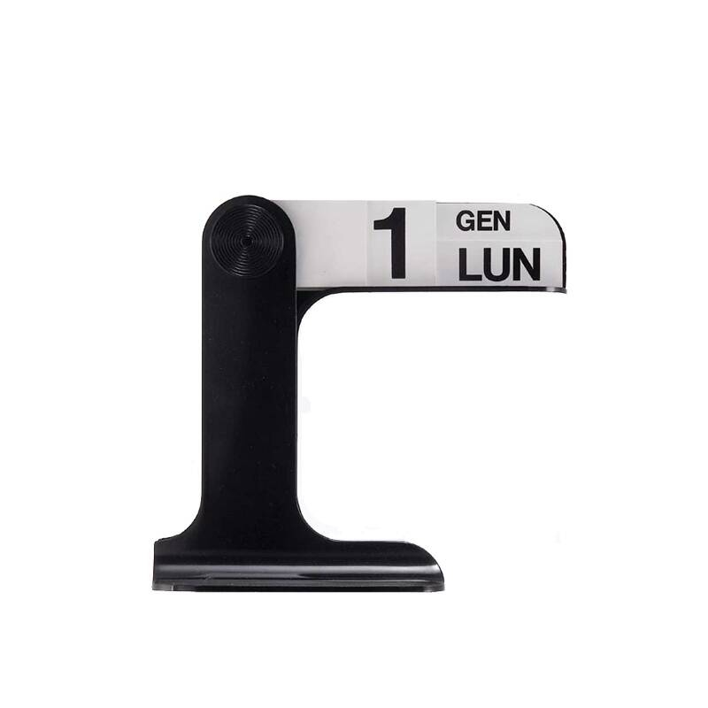 Created by designer and creator Enzo Mari for manufacturer Danese Milano in 1967, the Timor perpetual table calendar features an ABS base on which lithographed PVC sheets are displayed in a fan shape. Numbers, days of the week, and months combine to form dates in an original way that can be read even from a distance. Available in black or white, the Timor calendar is very graphic and has become a brand classic. Its sophisticated shape brings a subtly modern touch to your desk, bedroom or hallway. Delivered with French text