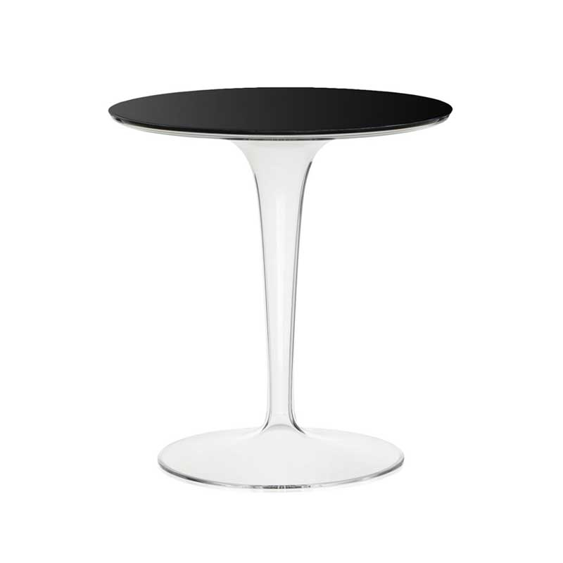 Tip Top is a small, sleek, and lightweight side table designed by Philippe Starck for Kartell. It consists of a single cylindrical leg on which a round top measuring 48cm in diameter is placed. The combination of the glossy top and the transparent, empty leg gives depth to the frame. Understated and contemporary, it can be used as a bedside table as well as at the end of a sofa, and comes with a black or transparent top.
