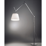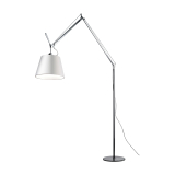 Tolomeo Mega Terra is the large-sized version of a series of lights created by Michele de Lucchi and Giancarlo Fassina for Artemide. This floor lamp has a polished aluminium articulated arm structure. A spring balancing system enables articulation of the arm. When fully unfolded, the Tolomeo Mega Terra lamp is 334cm tall and can be folded at right angles to distribute light at 148cm from the floor. Made of parchment paper, the diffuser can be rotated in all directions to give off direct and diffused light. The dimmer switch provides the option to create different lighting moods. Tolomeo Mega is also available with a silk satin diffuser, as well as in black. This floor lamp provides a soft atmosphere suitable for tables, desks, and living rooms.