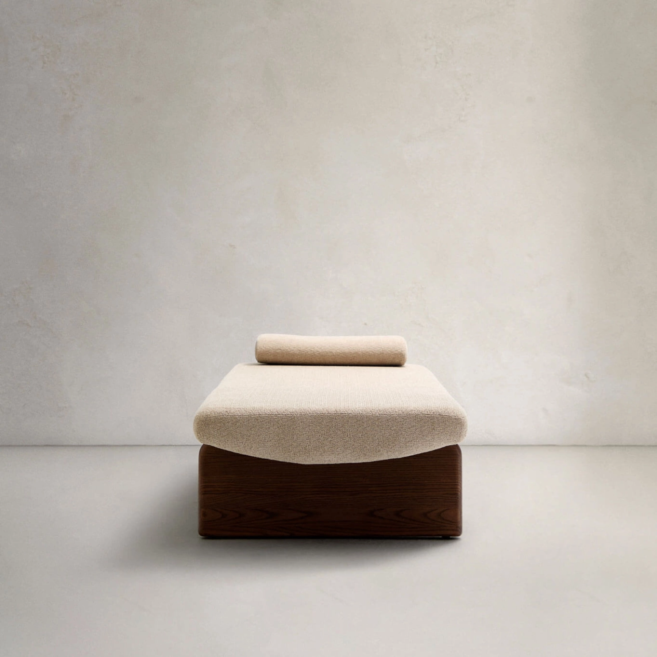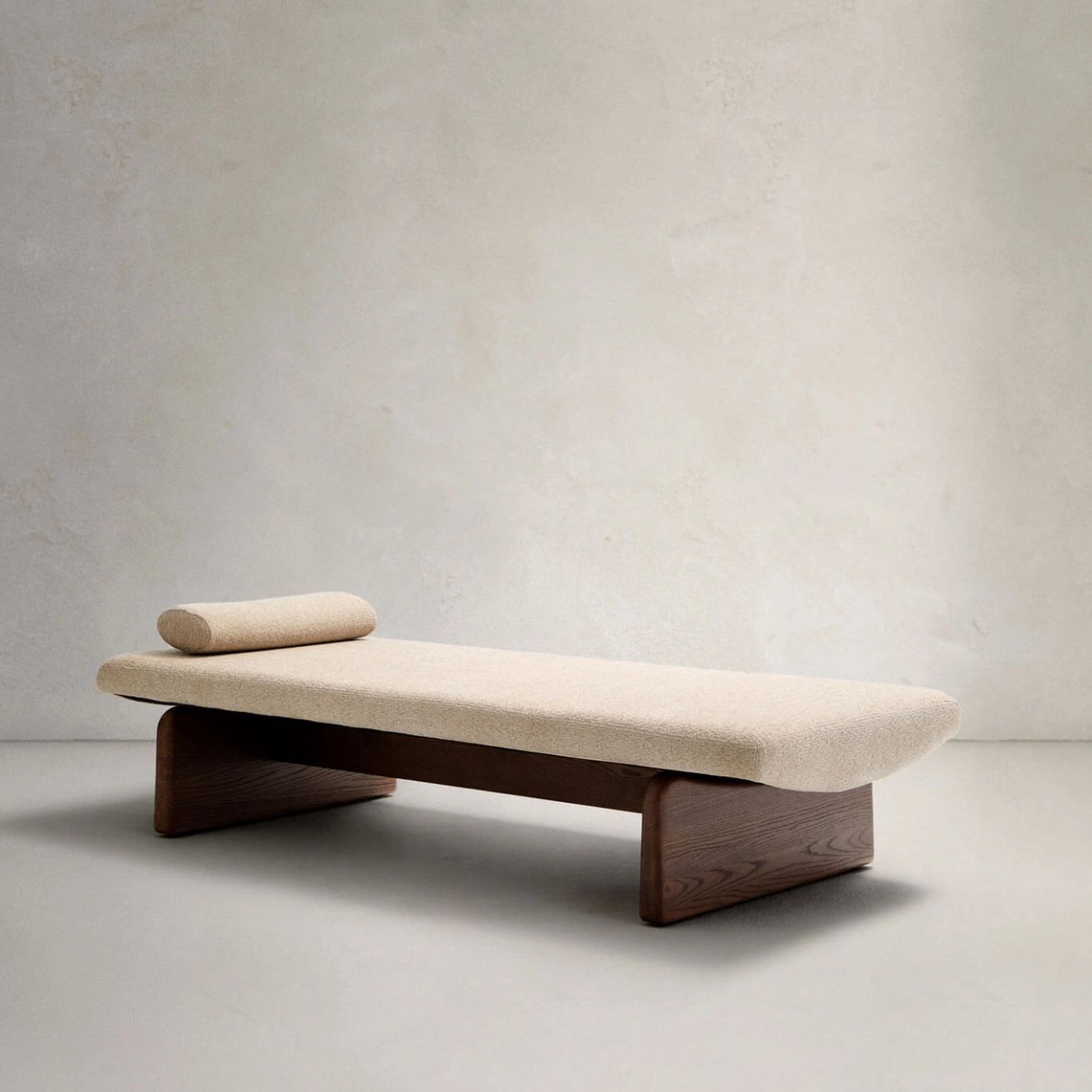 Walnut-stained ash wood frame, mattress and cushion in beige chenille fabric (included), foam padding