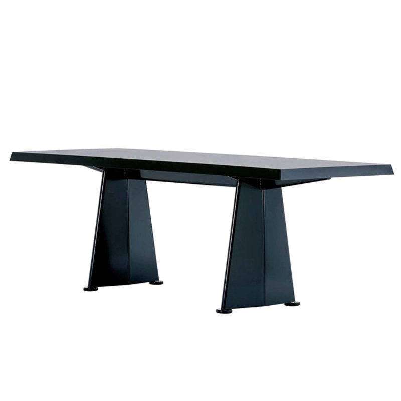 In 1954, Jean Prouvé created a series of furniture for the Antony university campus. The chair of the same name as well as the Trapeze table are the results of this project. Available in a length of 223cm and 332cm, this table is called Trapeze due to the characteristic shape of its two sheet steel legs. The large size of the structure is underlined by its wide edges bevelled towards the outside of the table top. Produced by Vitra, Trapeze table creates impact in dining rooms and is suitable for all interiors.