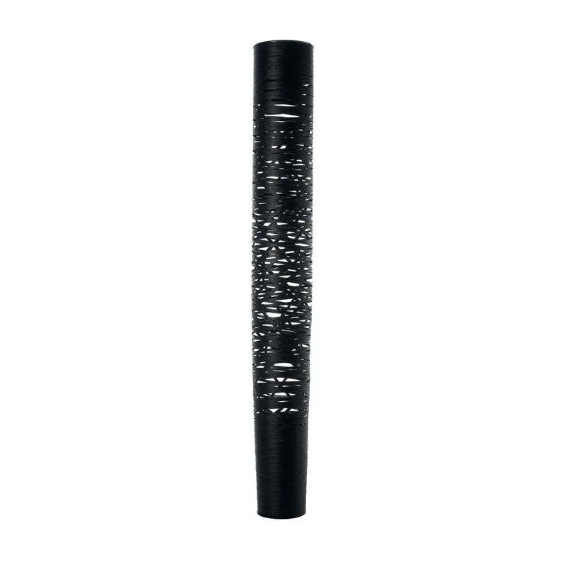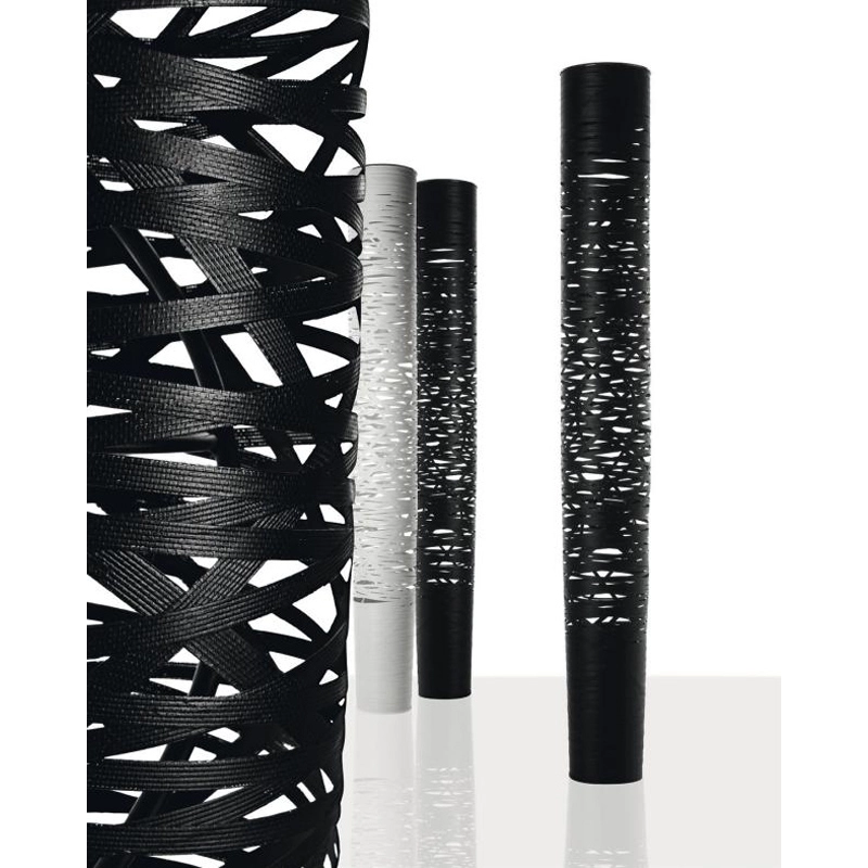 Tress is a floor lamp created by Marc Sadler in 2008. It is made of a lacquered fibreglass-based composite material and is available in black, red, and white. Produced by Foscarini, this lamp is made by interlacing ribbons and resin in an irregular fashion to create a structure as well as a decorative and protective element, creating a totally unique lighting effect that incorporates solids and voids, shadow, and light. The thread embedded in the interlacing of the structure creates a pure and refined aesthetic effect. This floor lamp has two light sources which are independent of each other.