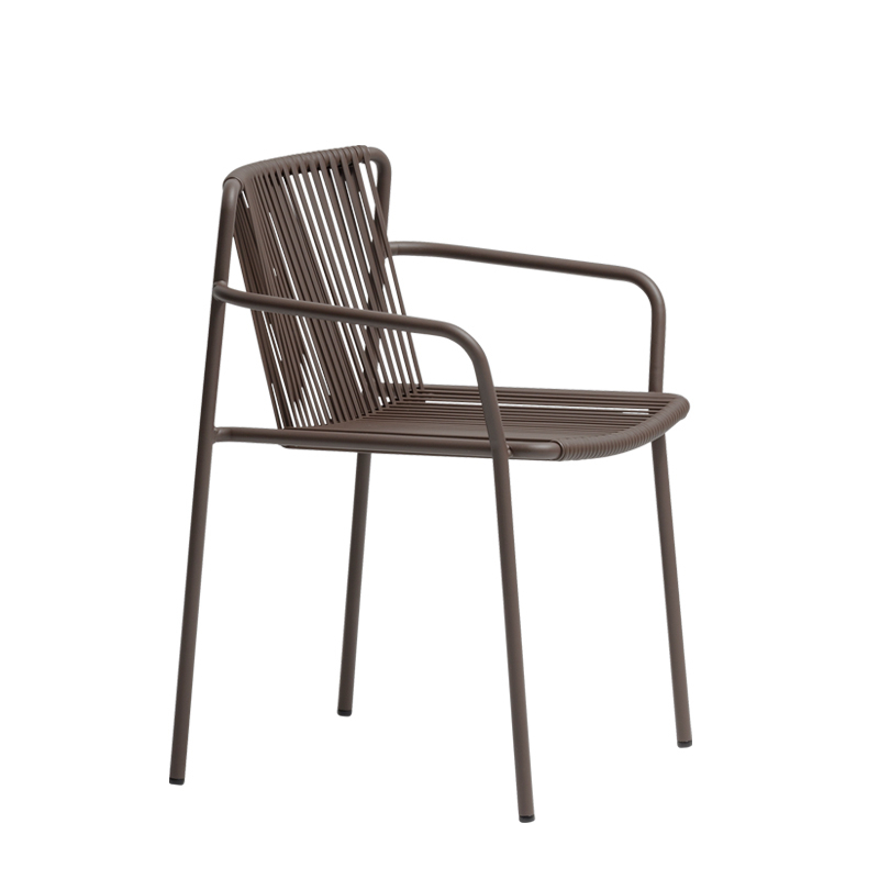 Edited by Pedrali, Tribeca is a modern reinterpretation of classic 60s terrace chairs in interlaced steel. The Tribeca chair features a Ø20mm tube frame painted for outdoor use. The back and seat are created from an interlacing of PVC thread reinforced with nylon. The technique and materials used have made it possible to provide a chair that is both comfortable and light. Available with or without armrests, the Tribeca stacking chairs are specially designed for outdoor use.