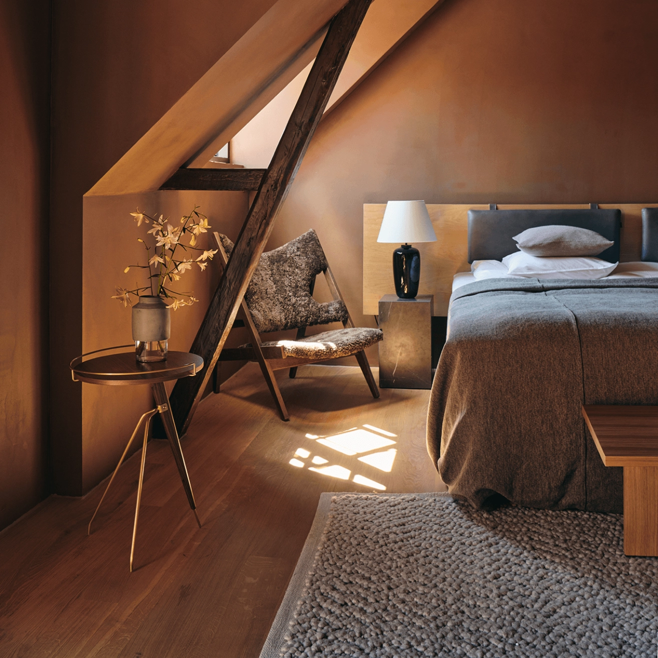 The side table UMANOFF Noyer 60 elegantly extends the modernist heritage reinterpreted by Audo Copenhagen, combining visual lightness and warm presence. Its refined design, supported by a fine and balanced structure, highlights the depth of the walnut, whose rich nuances and subtle veining give the piece a natural sophistication. In this 60 cm format, it asserts a more generous role while maintaining the delicacy that characterizes the collection. Ideal as a complement to a sofa in an upscale residential living room, as a side table in a lounge area, or within a hotel suite and a management office, it offers a comfortable surface for arranging books, decorative objects or everyday accessories. Its wider diameter allows a versatile use, alone or in combination with other heights, while maintaining great fluidity in the layout. The walnut harmoniously dialogues with textured textiles, deep leathers or mineral materials, enhancing the warm and contemporary atmosphere of the space. True to the UMANOFF spirit, the design is based on a subtle balance between fine lines and controlled stability, reflecting a sustainable vision where aesthetics and functionality are clearly united. The UMANOFF Noyer 60 side table stands out for its noble wood, elegant modernist writing, versatility in demanding residential or contract projects, and its ability to become a timeless accent at the heart of sophisticated interiors.