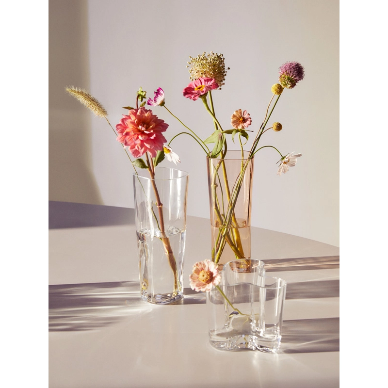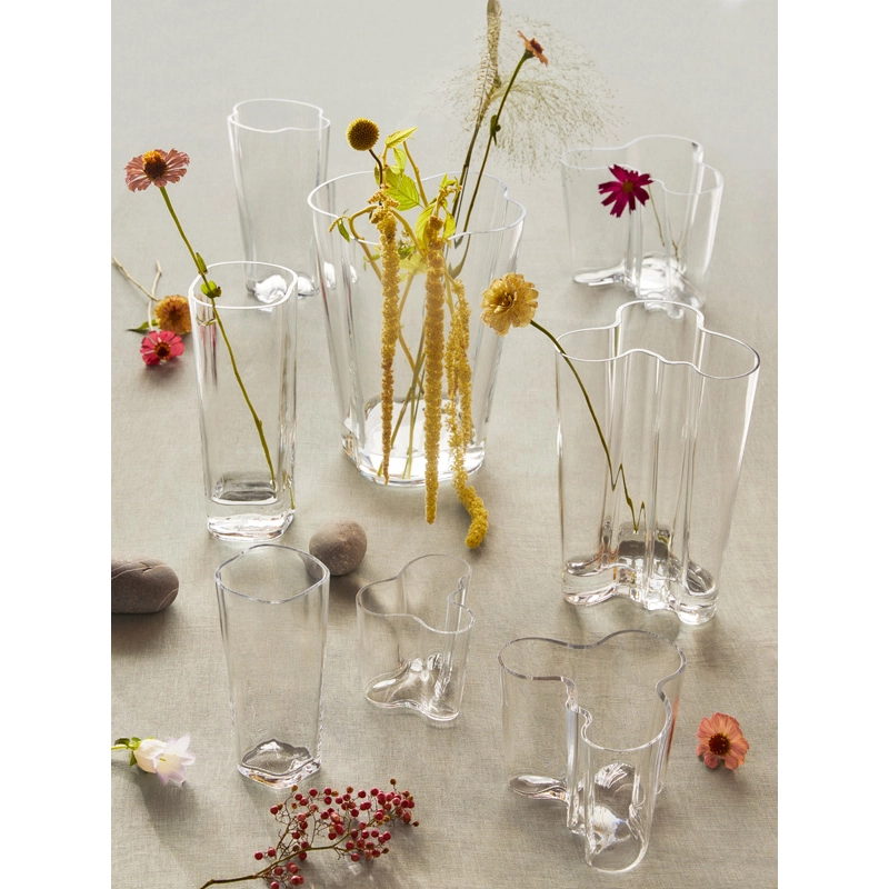 Alvar Aalto is one of the most important figures in 20th-century design and architecture. He created his own style inspired by man and nature. Aalto believed that good design should be part of everyday life and, with this in mind, created products that had multiple uses, were sensitive and improved everyday life. He never indicated how his glass objects were to be used, wanting users to decide their purpose for themselves. The undulating, flowing, organic shapes of the objects in this collection evoke the thousands of lakes that punctuate Finnish landscapes. The glassblowers at manufacturer Iittala still handcraft these legendary vases of serene beauty. The Aalto vase is available in various heights and colours. Since its presentation in 1937 at the Exposition Universelle in Paris, the Aalto collection has become a true masterpiece.