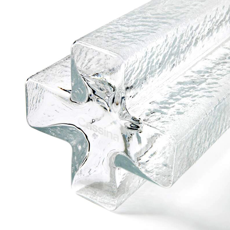 The Cross vases, created by Danish designer Bodil Kjær and published by Cassina, embody an inimitable aesthetic thanks to high-quality blown glass. The refined design of these cross-shaped vases offers four distinct spaces for holding flowers. Designed in the 1960s, the Cross vases by Cassina are designed to elegantly support flower stems, enhancing their beauty in a natural way. Available in three sizes (12, 23 and 27 cm), Cross vases are blown into cast-iron moulds, then delicately hammered, creating a surface unique to each piece. The Cross vases from Cassina a palette of three colours - extra clear glass, water blue and apple green - allowing you to choose according to individual preference. The ability to nest several vases together creates visually striking compositions, highlighting the uniqueness of each piece.
