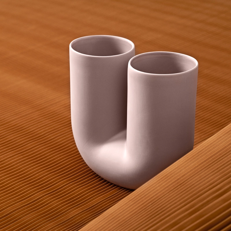 The starting point for the vase Kink was an exploration of how new forms could be created through the digital manipulation of simple shapes. The design combines this appreciation of modern technology with the traditional craftsmanship of ceramics, resulting in a piece that is both contemporary and sculptural. The graphic, playful look of the Kink Vase by Muuto - combined with its double opening, which suggests a new way of arranging flowers - adds a sculptural feel to the room, even when not in use. The vase is made from porcelain that has been enamelled on the inside for a refined touch.