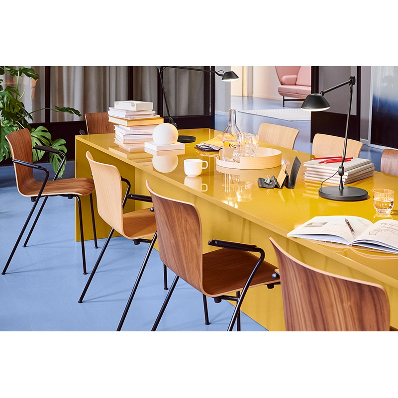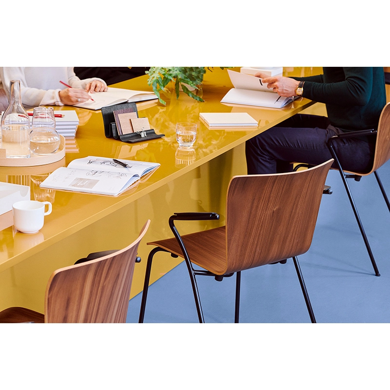 Fritz Hansen reissues the Vico Duo chair to mark Vico Magistretti's 100th birthday. The designer conceived this chair in 1997, sitting around his sketches in Fritz Hansen's dedicated design department. He wanted to collaborate with the brand, to benefit from its expertise in veneer. The chair has a simple design with narrow lines. A freely drawn 'Z' line on the sketch inspired the back of the chair's armrests - an unusual element that intentionally balances the design. The armrests and the legs at the rear are made of a single piece of steel - another unique aspect of design. Fritz Hansen combines beauty and functionality with this elegant stackable veneer chair.