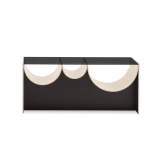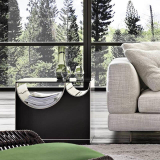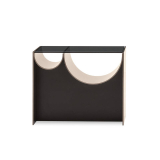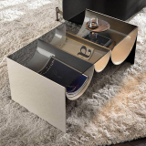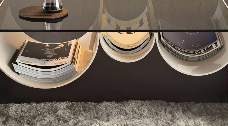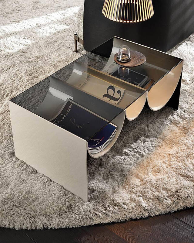 Waves coffee table features a grey smoked glass top supported by a painted aluminium frame - sand or light bronze on the outside and pewter on the inside. The series of inverted semicircles that comprise the table's sinuous profile form hollow spaces where magazines, newspapers and small objects can be displayed in full view. Designed for the living room, but also suitable for other spaces, it is available in four sizes. Designed by Nendo for