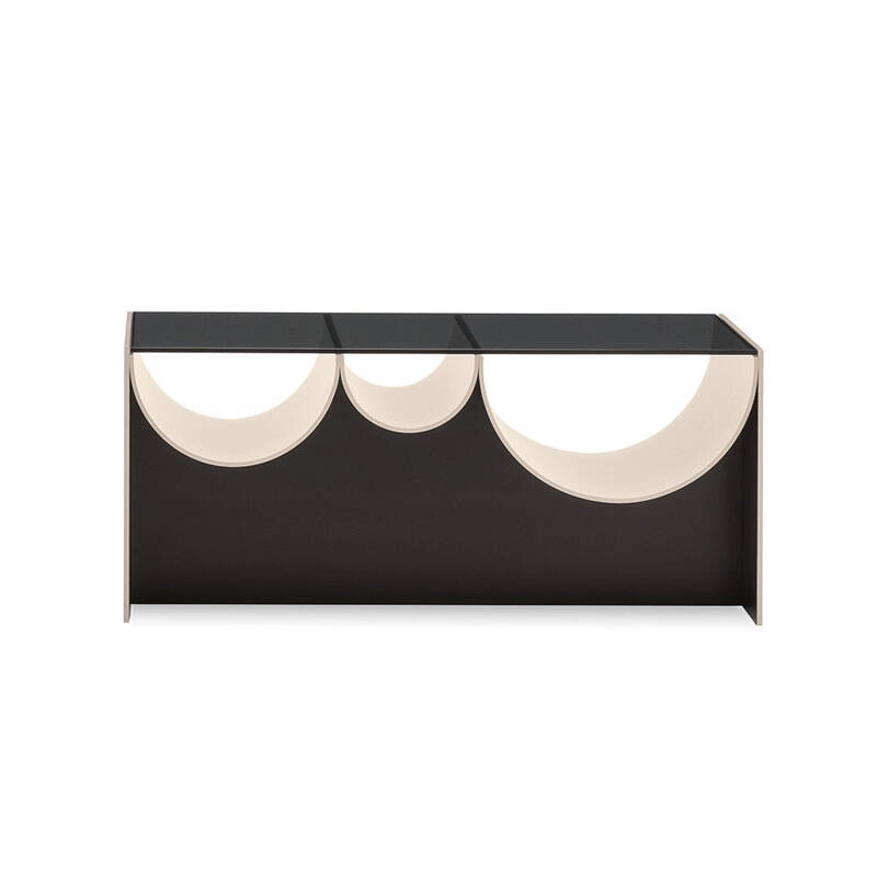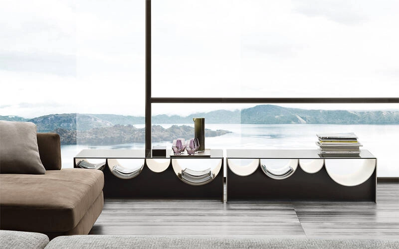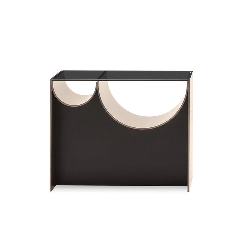 Referencing the waves of the ocean, the Waves coffee table features a grey smoked glass top supported by a painted aluminium frame - sand or light bronze on the outside and pewter on the inside. The series of inverted semicircles that comprise the table's sinuous profile form hollow spaces where magazines, newspapers and small objects can be displayed in full view. Designed for the living room, but also suitable for other spaces, it is available in four sizes. Designed by Nendo for Minotti, Waves can be placed alongside other identical tables to form a modular sequence playing on transparency, voids and the lightness of lines.