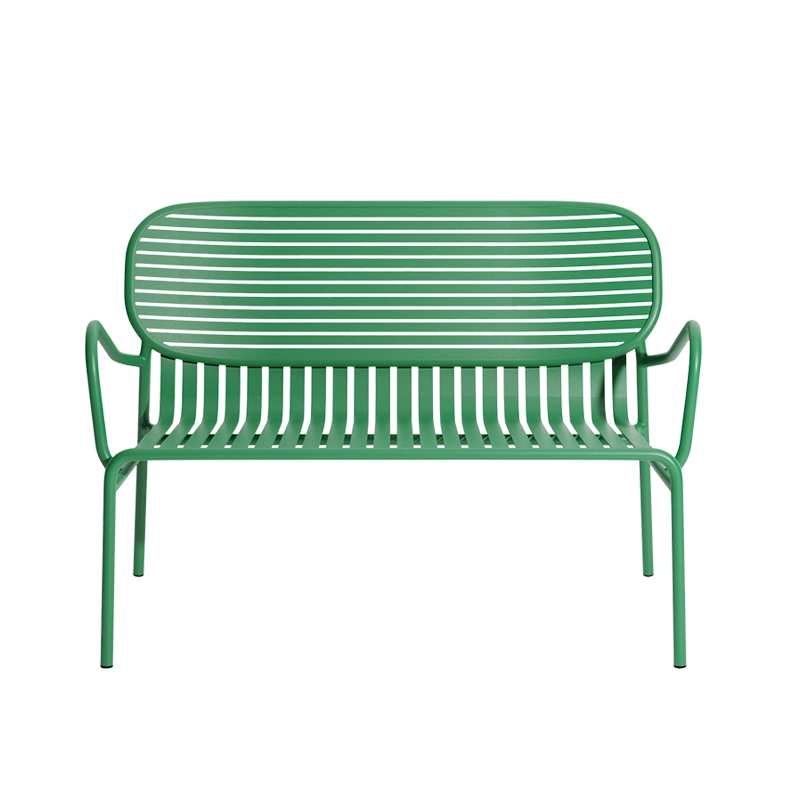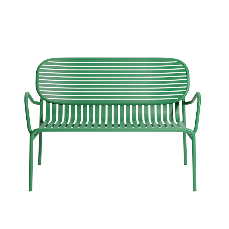 With Week-End, the French brand Petite Friture sets its singular gaze on summer and offers with the studio Brichet-Ziegler a graphic and contemporary approach to garden furniture. This one is played with a rhythm of horizontal and vertical bands skillfully placed on a structure with strong lines. The strips of this outdoor sofa that characterize the Week-End collection published by Petite Friture, are made from laser-cut aluminium sheets in a single piece and not assembled slats, allow the removal of uncomfortable screws or welds. The work of horizontal and vertical slats, like stripes, emphasizes solids and voids, affirming the identity of the collection. The Week-End collection is a complete range of outdoor furniture. The precise colors selected for this collection mark alone or in combination the skyline of a balcony, terrace or garden. This bench is available in several colors such as black, yellow, jade green ... The colouring of the Week-end collection, by Petite Friture, in a grained anti-UV epoxy powder paint guarantees an impeccable maintenance of the hues over time. The design bench proposed by Petite Friture, was designed with the obsession to make the most of materials and techniques available to designers. Made of aluminium, a material selected for its lightness and weather resistance, the Week-End collection combines aesthetic comfort and practicality. Indeed, this collection is resolutely designed around a practical use because all the seats are stackable.