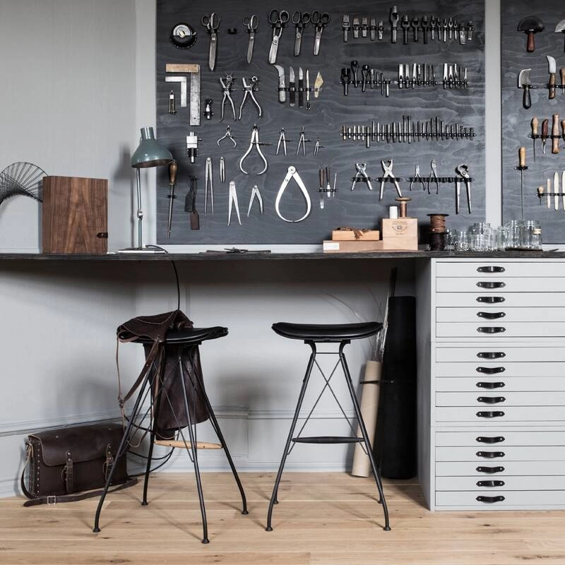 Produced by Overgaard & Dyrman, Wire is a seating collection that draws its inspiration from traditional horse saddle making and metalworking, and explores the contrasts between these two high quality materials. The Wire tall stool consists of a steel frame, available in satin chrome or black epoxy finish, and an aniline leather seat, with a natural texture that takes on a beautiful patina over time. Available in two heights, it fits perfectly in a kitchen, restaurant or bar. The Wire collection is manufactured in Denmark by skilled and dedicated craftsmen, who master remarkable craftsmanship in all stages of production.