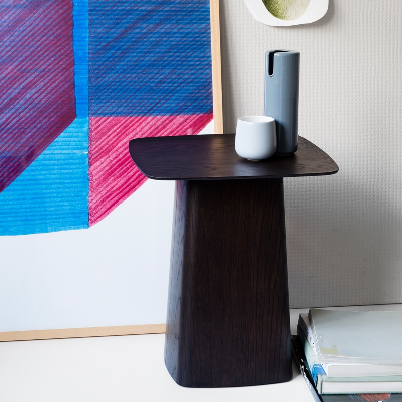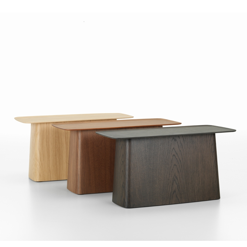 The Side Table family has grown with a new moulded plywood version: the Wooden Side Table. These small, elegant side tables belong to the category of furniture that does not form the basis of the furniture but is nevertheless indispensable as a complement to it. Easy to move around and multifunctional, they are small, discreet, supplementary pieces that perform all kinds of valuable services. Thanks to their balanced proportions and the seductive formal contrast between the slim table tops and the voluminous plinth-shaped legs, these occasional tables suit the most diverse environments. Produced by Vitra, Wooden Side Table is available in three sizes.