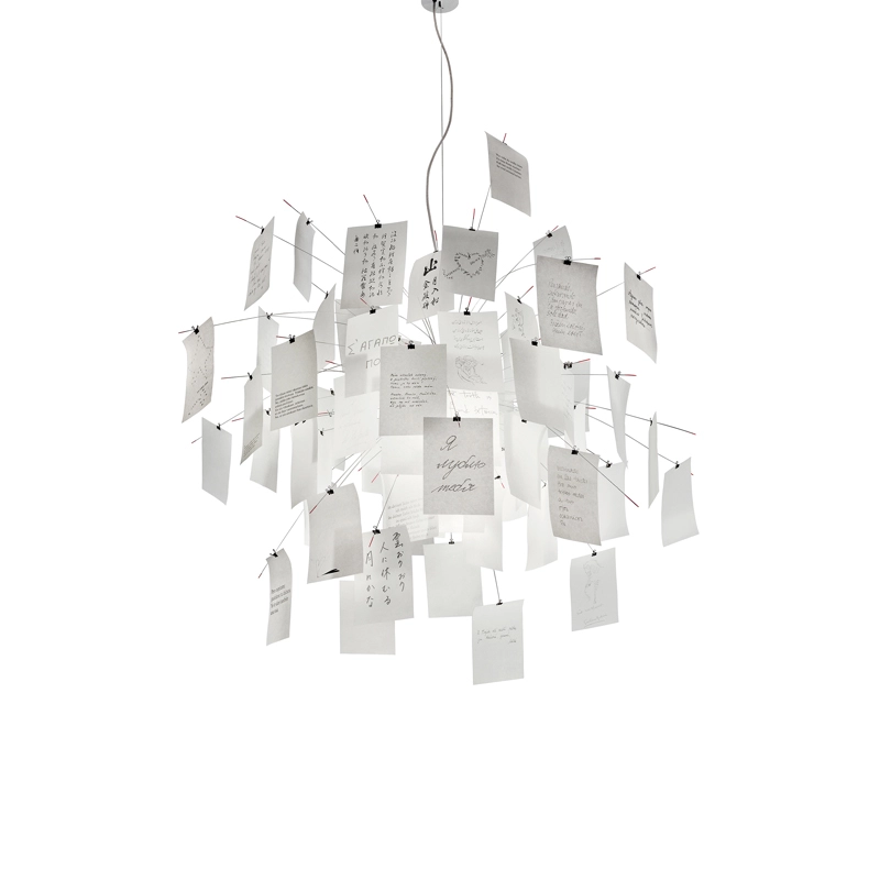 Zettel'Z 5 is a stunning pendant light designed by the talented Ingo Maurer. It features a structure made from steel stems with sheets of Japanese paper attached to the ends. Gentle and poetic, the leaves appear weightless. Each one is suspended using a small clip, so that you can hang or unhook them to personalise them in line with your preferences, as many times as you wish. This pendant light therefore becomes a unique piece. Your guests are sure to notice it as it hangs in the hallway or above the coffee table. Zettel'Z 5 is an exceptional light fixture that creates a gentle and ethereal light source. It is sold with 31 decorated sheets and 49 white sheets.